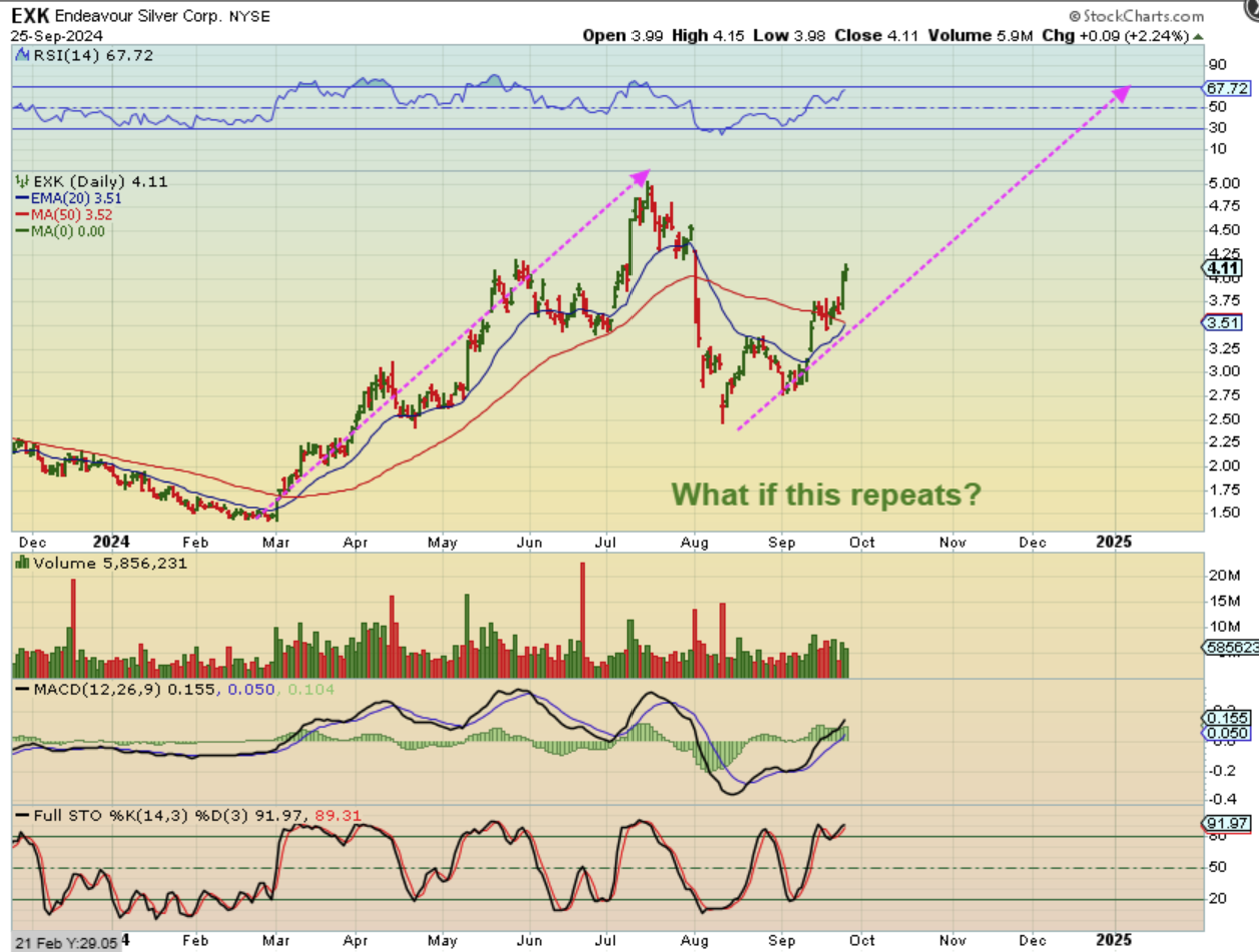 EXK – LAST WEEK I pointed out the Silver stocks and mentioned that a few double bottomed off of the 200sma and were crawling along the 50sma. Silver had an ICL, so these could be bought now or on the next dcl. This chart was in that report…