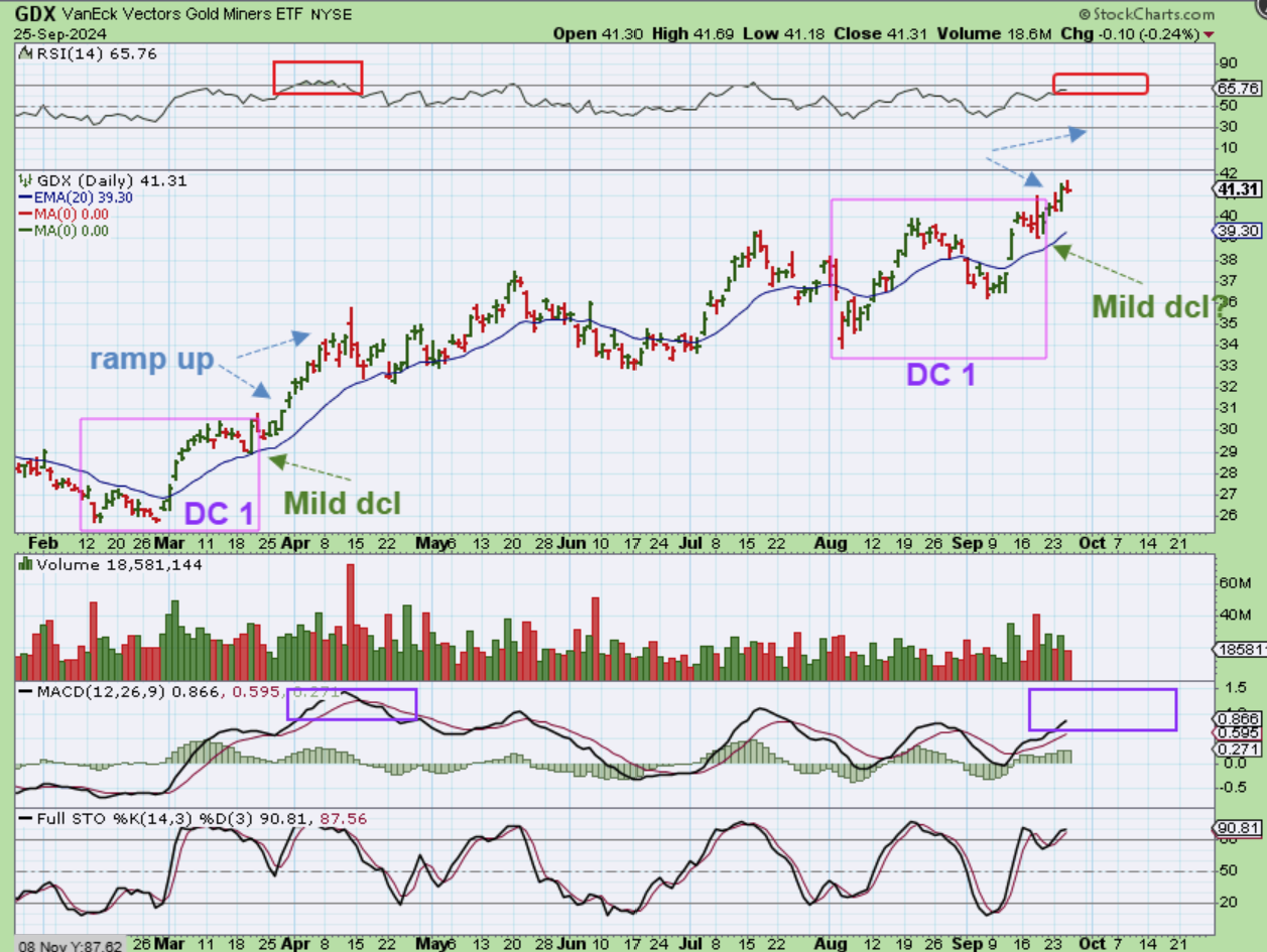 GDX can ‘ramp up’ into a nice run higher if Gold & Silver do. GDX ran well in March, April, and May. It was choppy at times, but as pointed out in yesterdays report, milder dcls were put in place at that time. Notice the RSI & MACD Here vs April too.