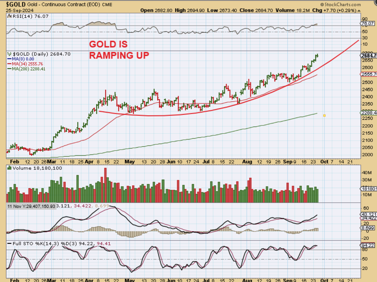 GOLD could be starting a steeper incline. I could say MAYBE, MAYBE, MAYBE, in a parabolic run to $3000 and then a drop into the next ICL. That remains to be seen, but I had to mention it as a possibility.