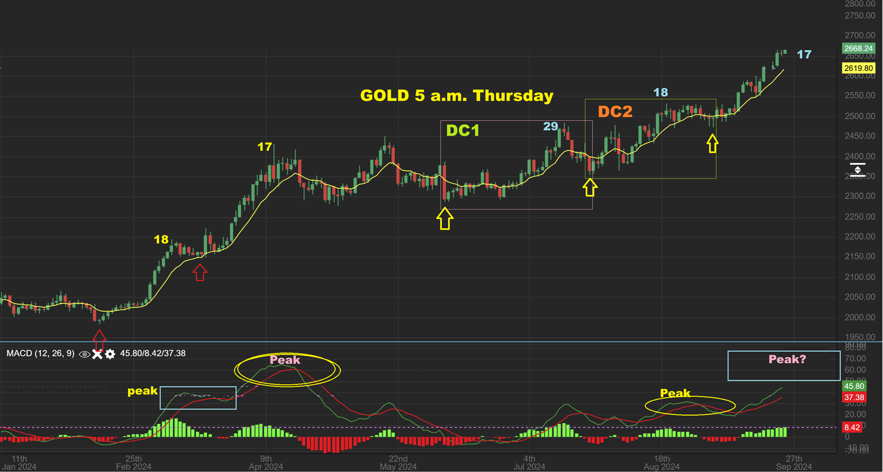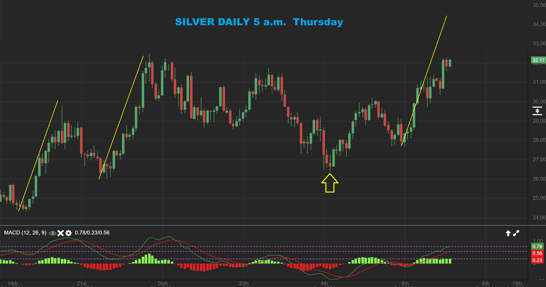 GOLD is now continuing to run up and along that 20 ema, and now it even looks to be a bit steeper as it runs higher in this 3rd daily cycle.