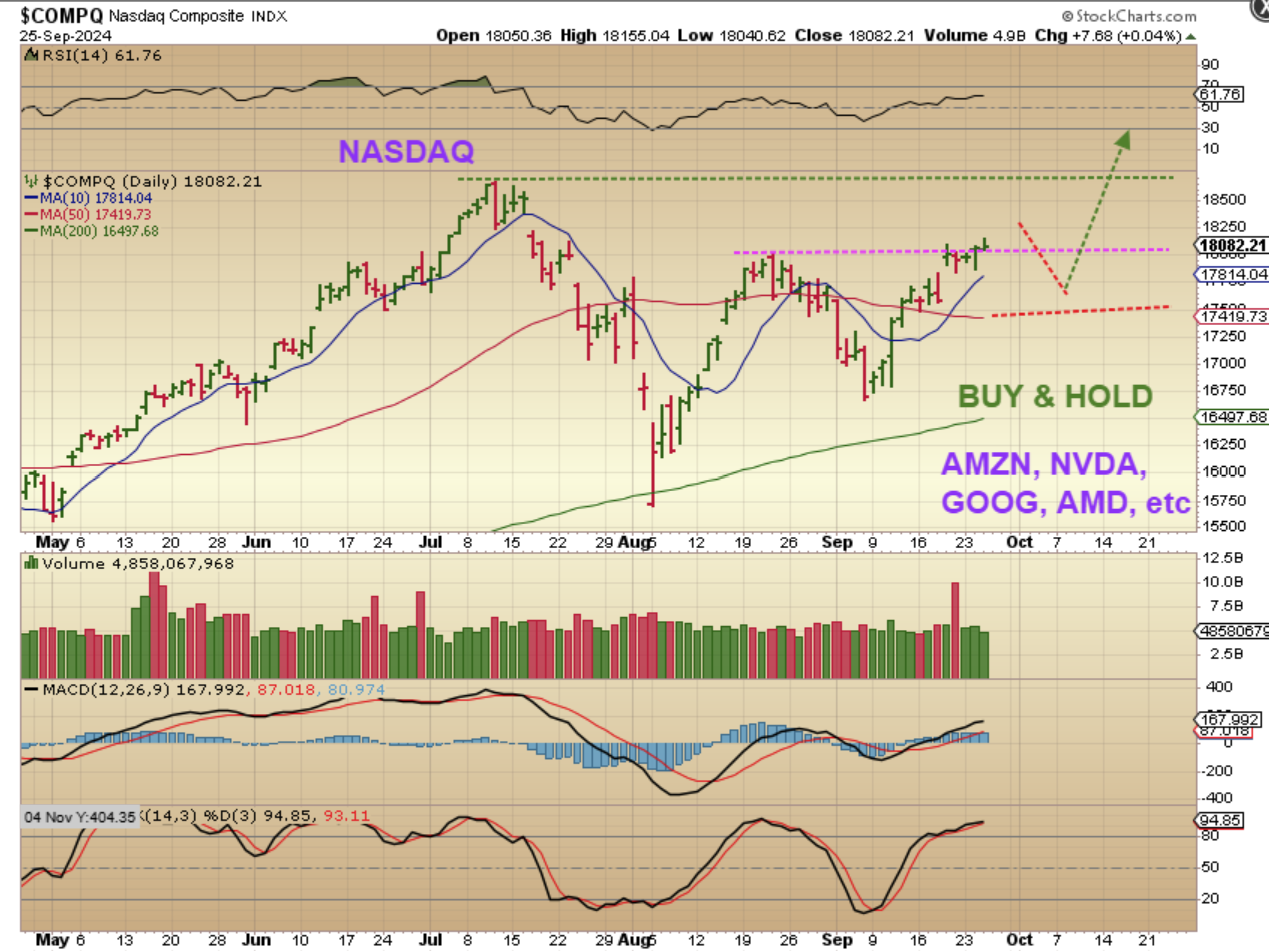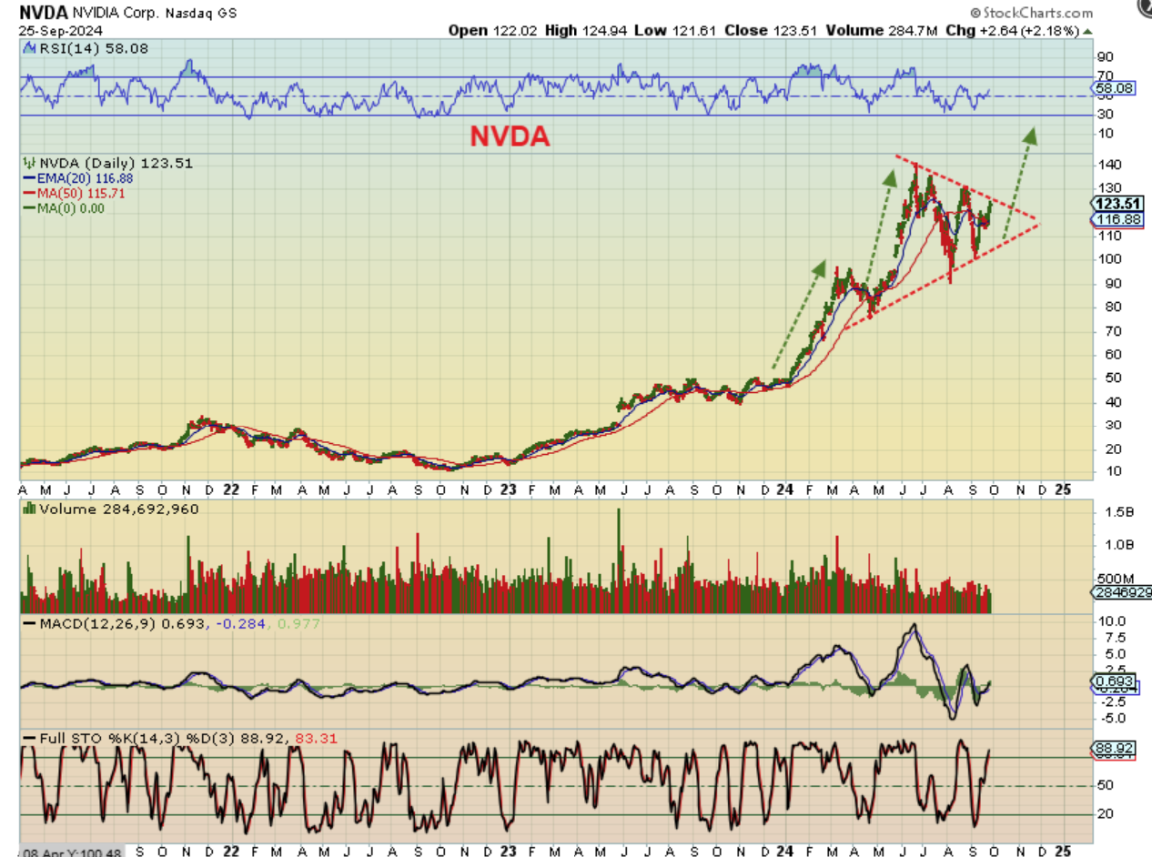 SO IS THE RUN DONE (?), OR IS THIS JUST A BULLISH CONSOLIDATION / STALL? If it continues higher with repeated rate cuts, we may wish that we bought it in this triangle area. Or AAPL, GOOG, etc.