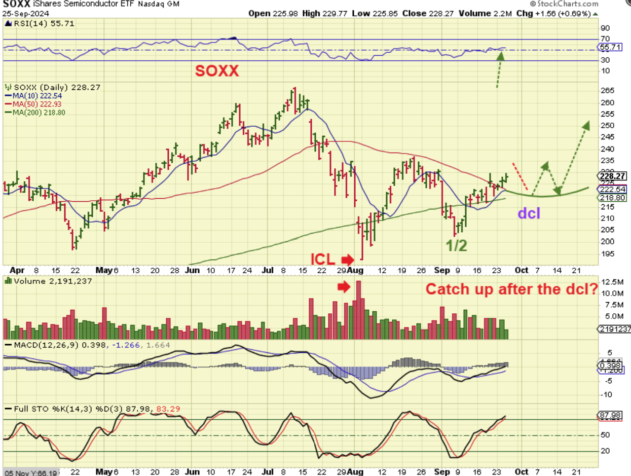 THE SOXX is still just choppy and it may remain that way for now, so we may have to wait for the next daily cycle to see if it can get any traction. IF IT DOES NOT get moving, it is likely that the General Markets will chop sideways and struggle too. If the SOXX runs up to its former highs as drawn here, the SPX & NASDAQ will continue the bull run too.