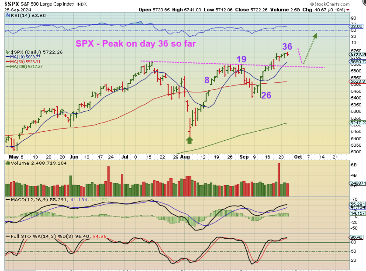 SPX – On day 36, this has been a bit of a choppy run out of the ICL and 1/2 cycle low, but it did make it to new all-time highs. Since daily cycles run 35-40+ days in length, we could be near a ‘peak’ and therefore we have to expect that we’ll see a dip sooner than later, and that dip will be a buy (DCL).