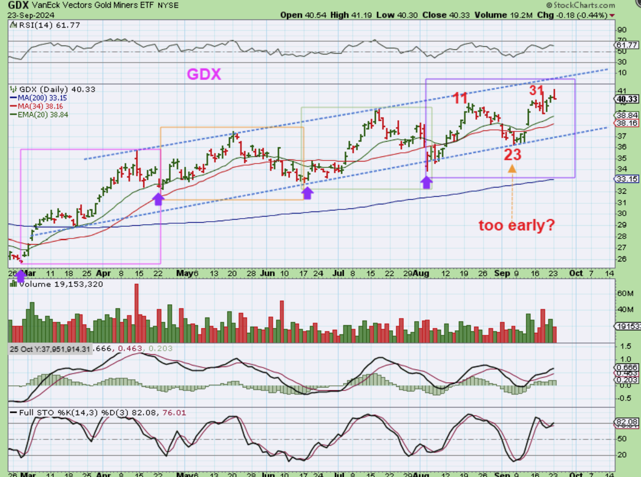 GDX cycle count is very similar to Silvers count. I was thinking that the day 22 or 23 area is too early for a dcl, so that day 31 pop and drop could be a dcl, matching Silver. On Monday we also saw GDX pop and drop.