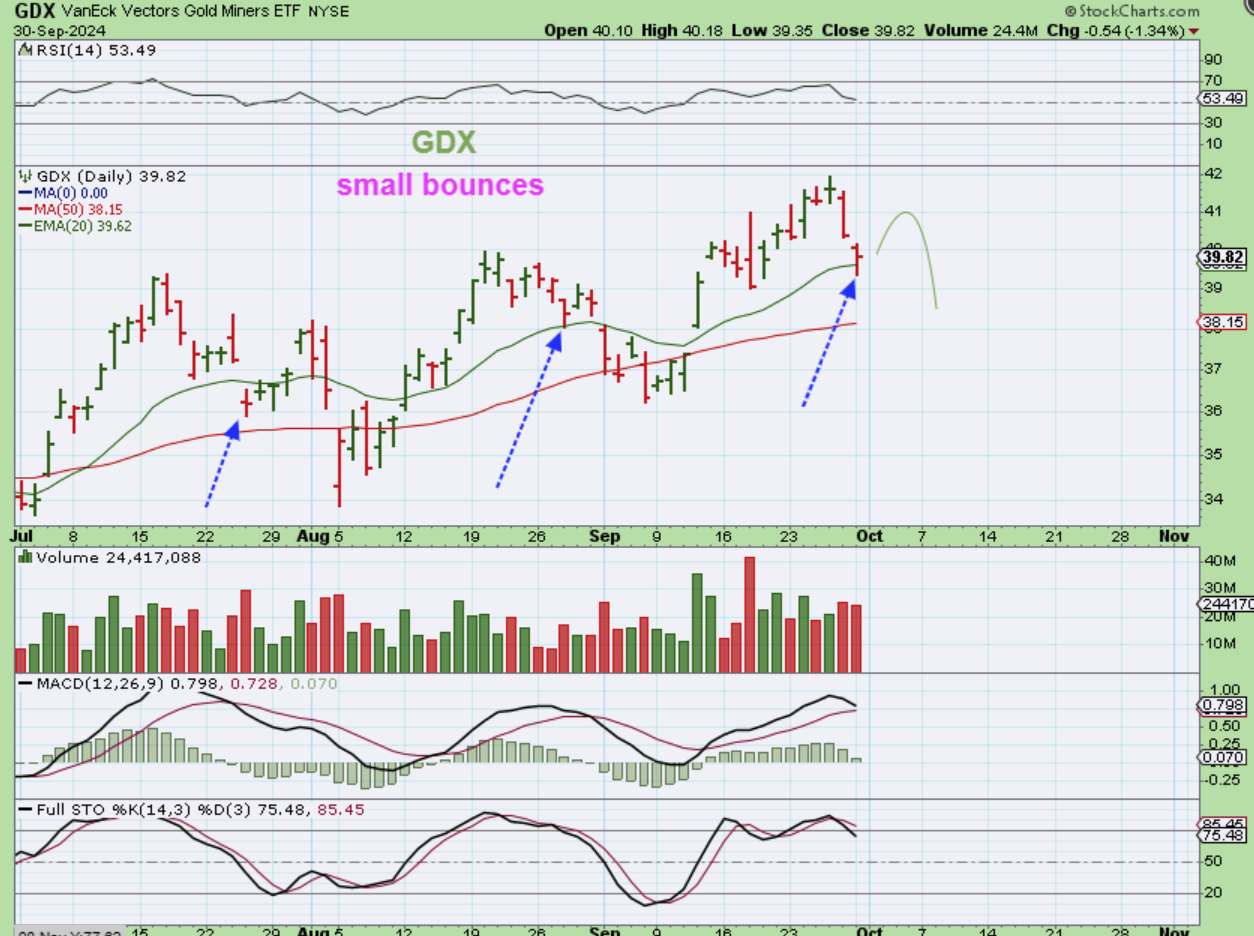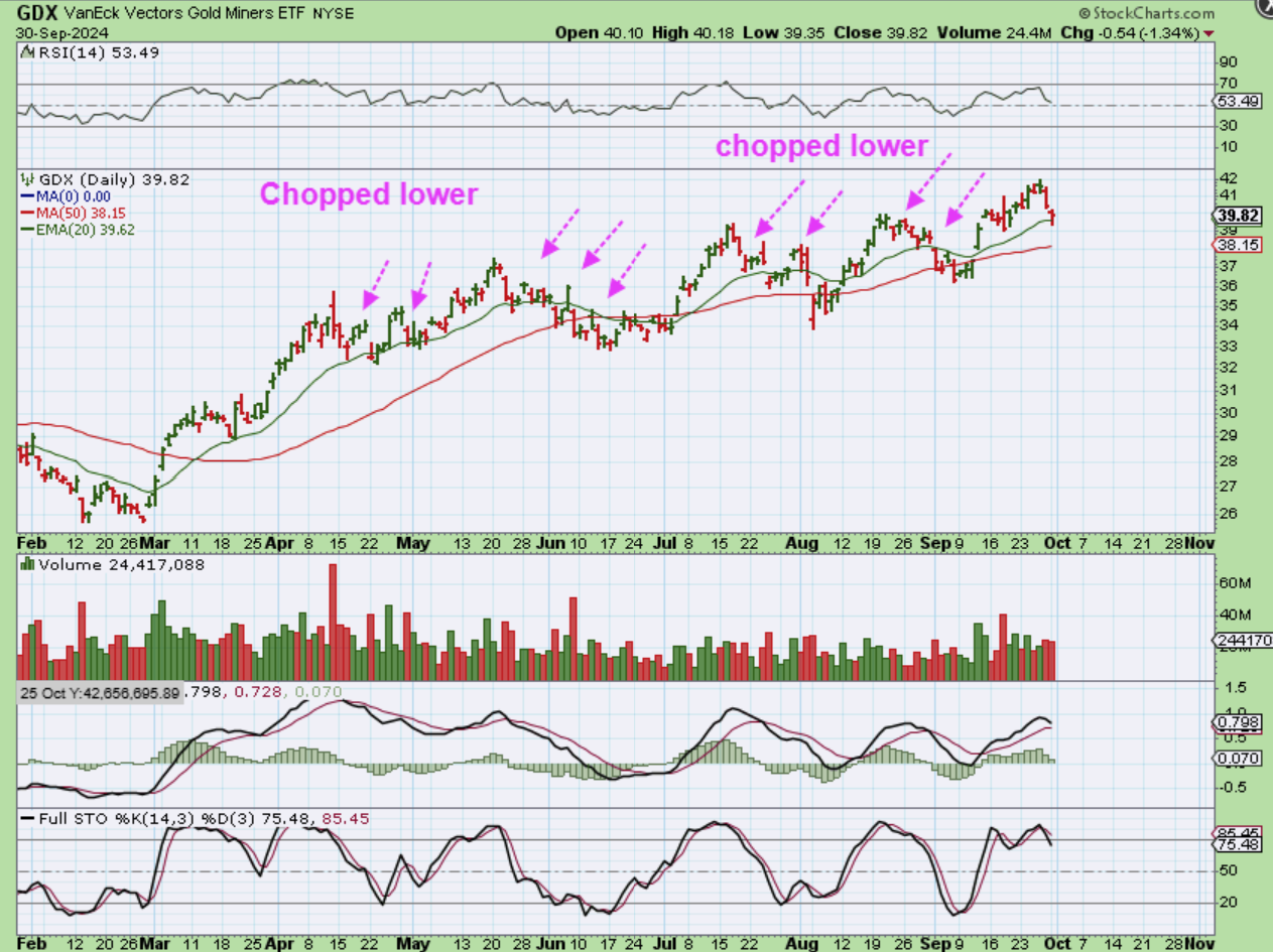 GDX dropped to the 20ema and bounced into the close. I wanted to point out a couple of areas where it did that in July and August, since those bounces only made it choppy. In fact…