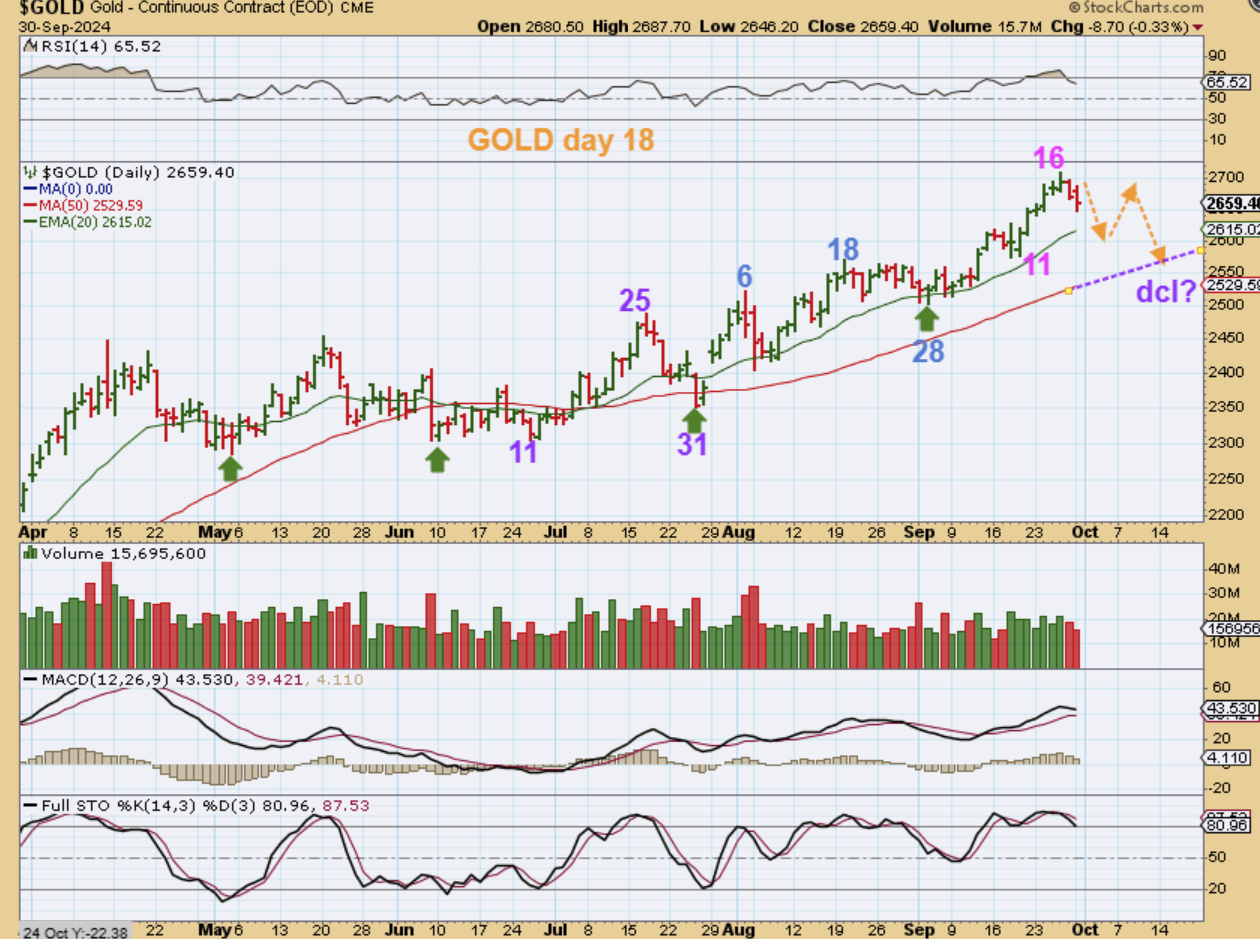 GOLD looks to have a day 31 dcl and a day 28 dcl. Now it has a day 16 peak and is dipping lower. It seems a little early for a dcl, so I put a bounce in there as a possibility, to give Gold a milder dip.