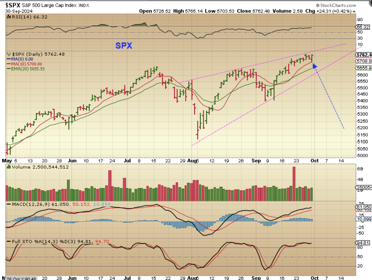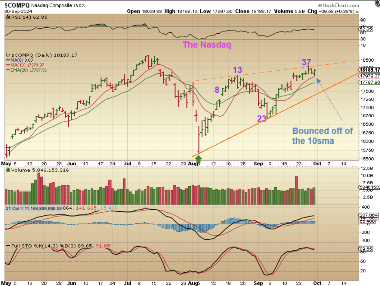 THE SPX dropped on Monday morning, but interestingly, it bounced right off of the 10sma. If you really look at this chart, you’ll see that last week was a choppy up and down week too. I see a rising wedge and they often break down over time (dcl).