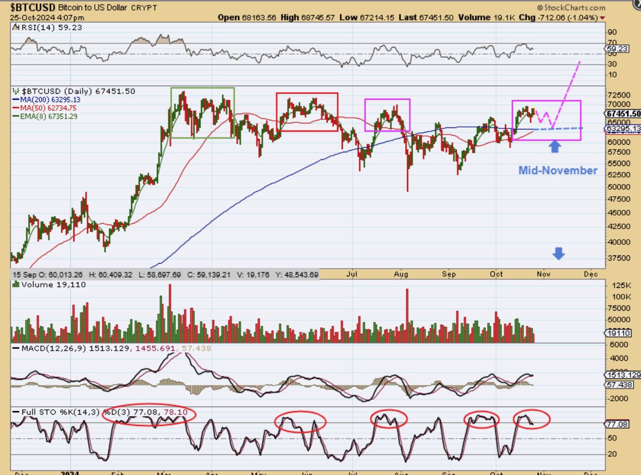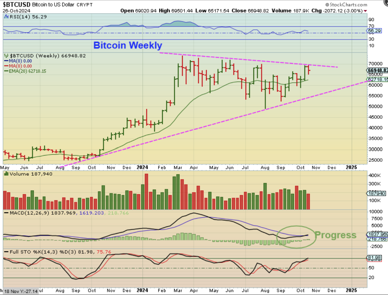 Bitcoin could breakout at any time, but we also know with the choppiness, Bitcoin could drop & chop further. I want to discuss this a bit further in the weekend report, but Bitcoin is currently near the highs, and I have said that a $70,000 print will be a decent visual move above the slanted upper trendline.