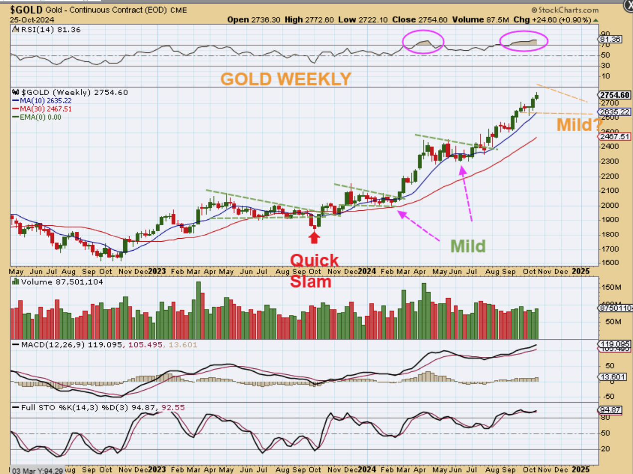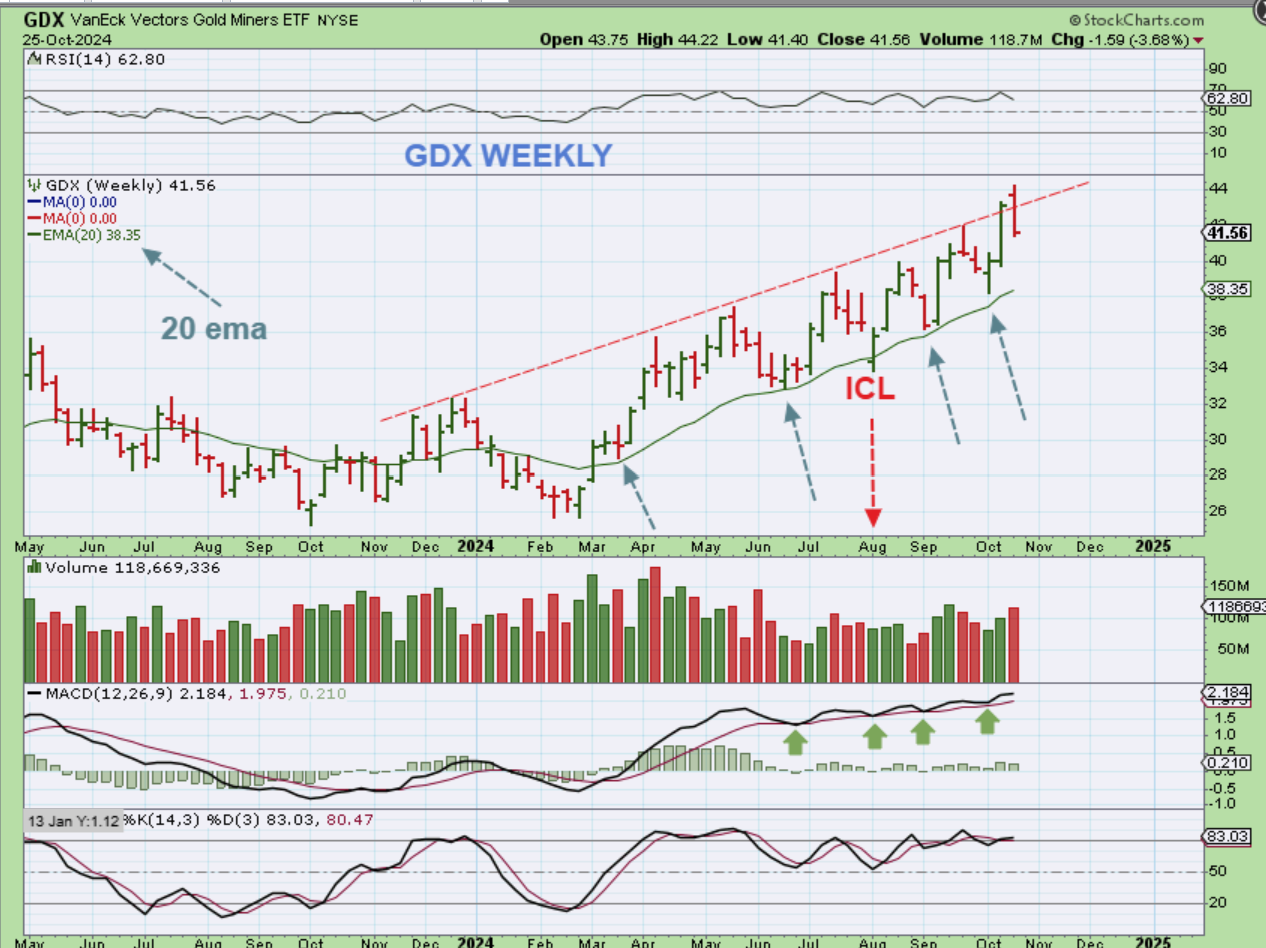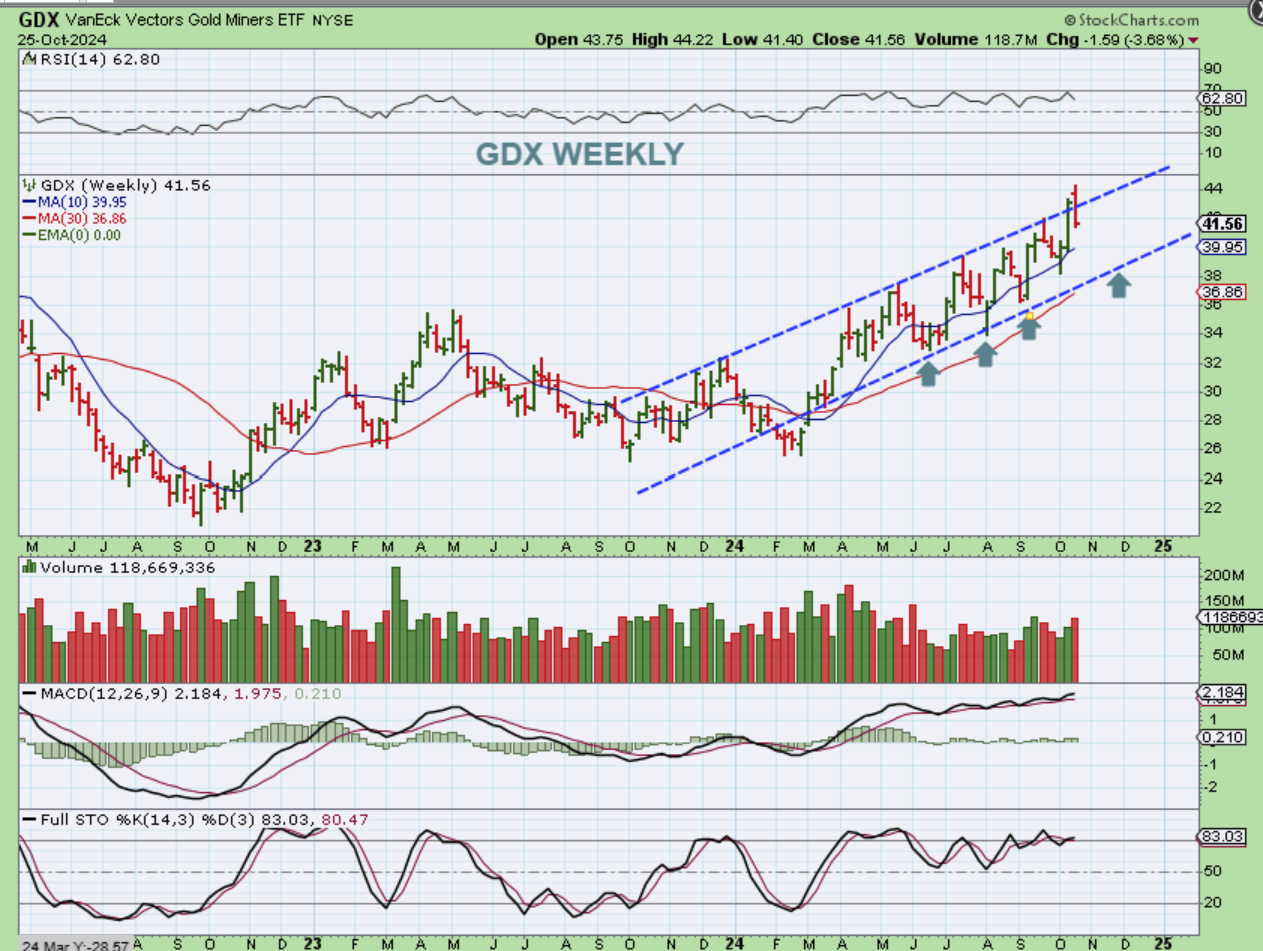 GDX WEEKLY: GDX has been very choppy too. In hindsight, it looks good in 2024, running from $25 to $44, but the ‘swings’ of the daily cycles have been large, making ‘Buy & Hold’ tricky.