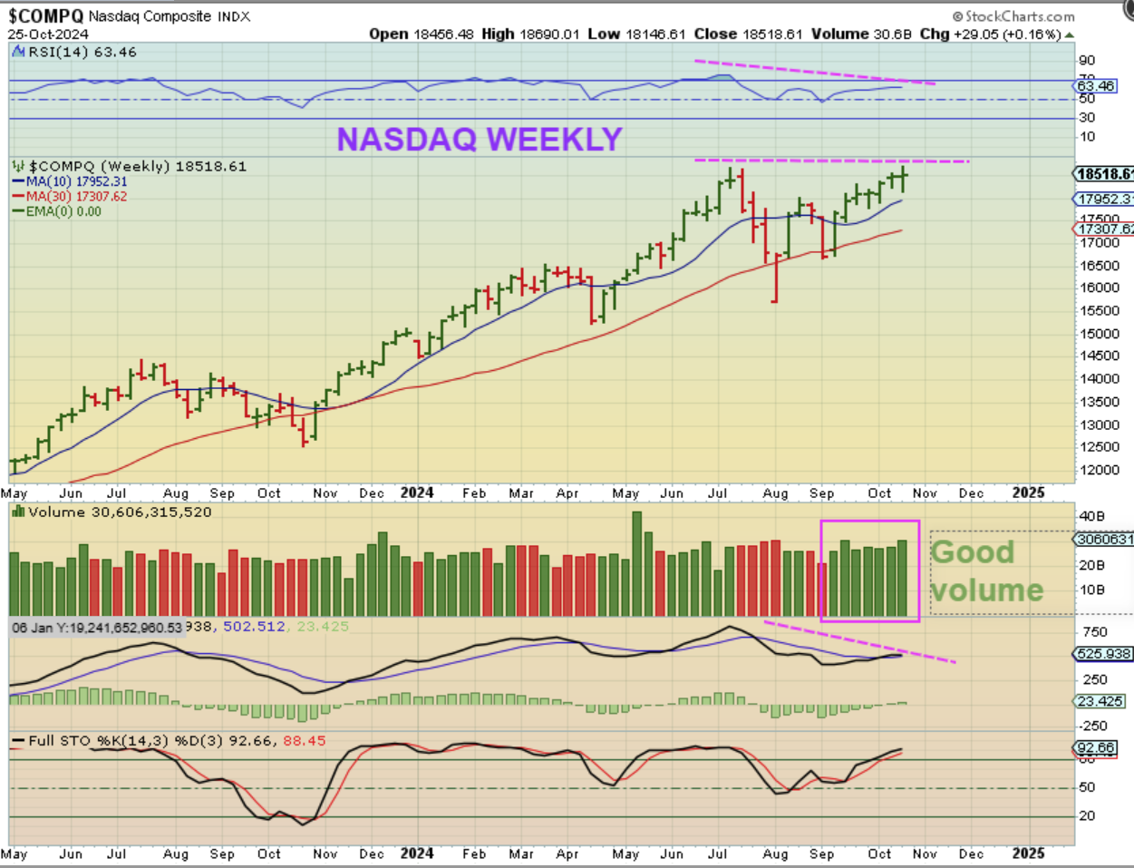 THE NASDAQ WEEKLY formed a doji or indecision candle. As we reach the prior highs, I do see great volume, but I also see negative divergence. This is not a bad chart, but it just need to see some upside sooner than later. P.S. The next Fed meeting is a week and a half away.