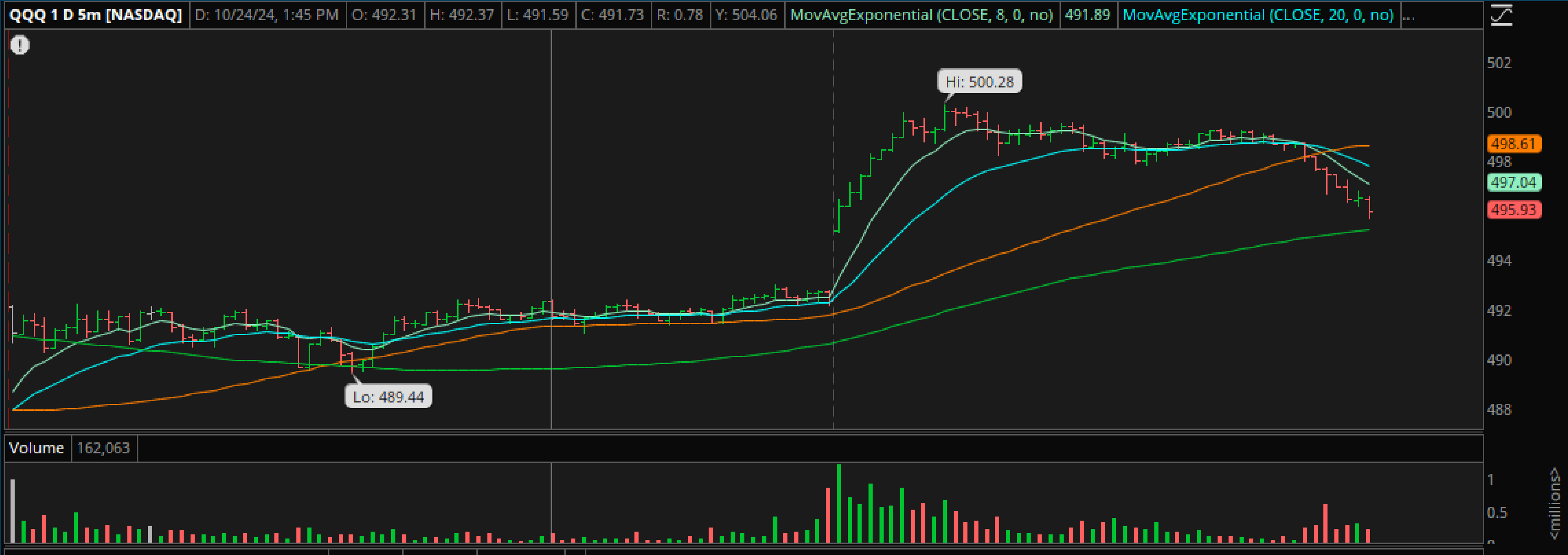 Using the QQQ 5 MINUTE chart, so can see how the markets gapped open higher and started off with a rally, but then chopped sideways, lost steam, and sold off into the end of the day.