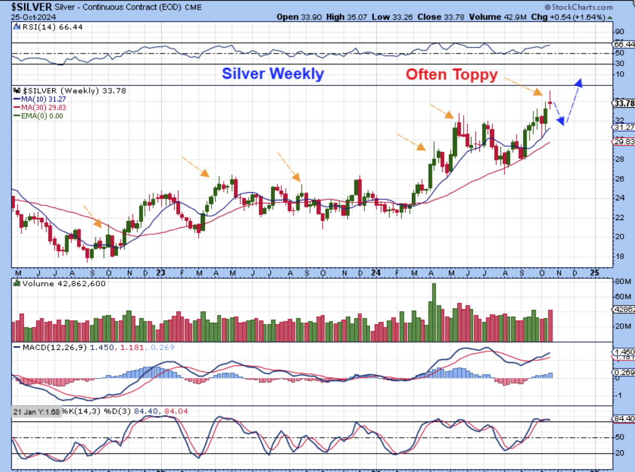 SILVER has what looks to be a toppy weekly candle. Silvers run is not in sync with Golds and it has not been as smooth and steady as Gold, but that can change over time. Silver broke out recently and if it back-tests & reverses higher, it could make a nice move over time. In 2024, Silver has moved from $22 to $35, and that is great, except that it has been very choppy and difficult.
