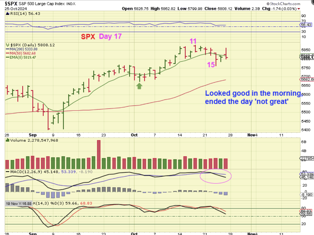 SPX DAILY– The markets have chopped sideways for a while and seem a little ‘heavy’ lately, unable to start a rally. We saw what could be a day 15 half cycle low, and then Friday started to take off higher, but that rally also sold off into the close. So far, we are waiting for some upside to continue the bull run, or this may have peaked on day 11.