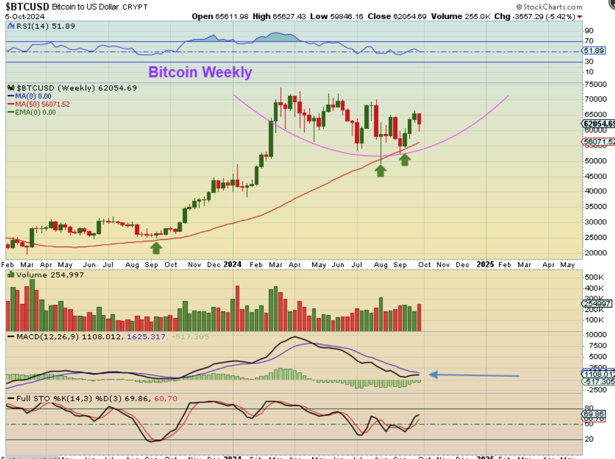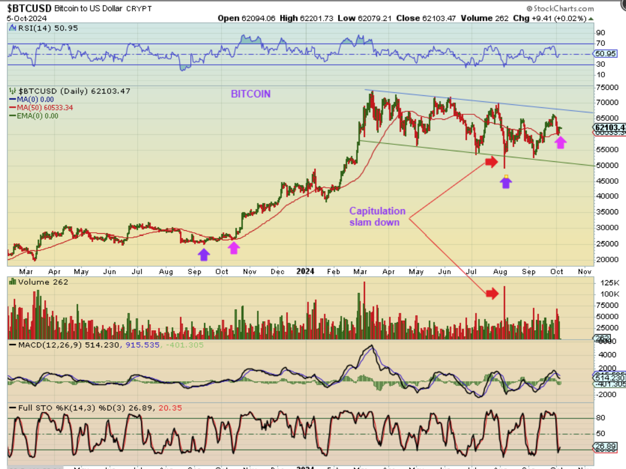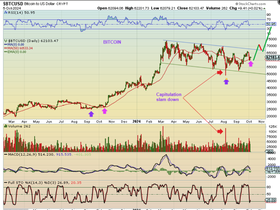 BITCOIN DAILY: This is a long bullish consolidation, and it had a sharp sell off with capitulation type volume as the lowest point in August, so we’ve been counting out the 60 days that follow to see if we get a higher low or not. We are now at that day 60 point, and Bitcoin bounced at the 50 sma.