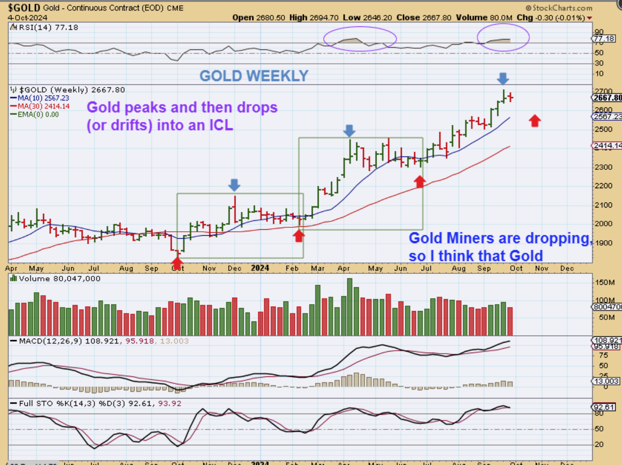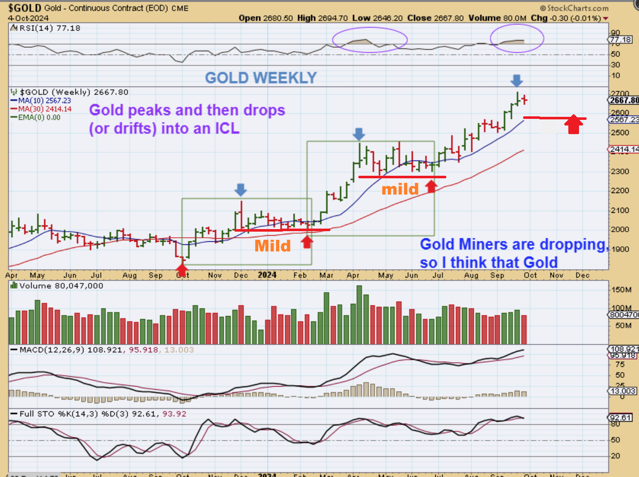 GOLD WEEKLY – Gold is on its 3rd daily cycle and with the USD running higher, it may be that Gold ‘peaked’ 2 weeks ago after a very nice run to new all-time highs. It can begin to pull back and gradually give us our next ICL in November or maybe December, but notice that the last 2 ICL’s were almost stealth because it was so mild. Gold dipped and chopped sideways. Note; my last Red arrow should be over in November / December.