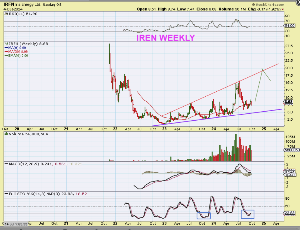 If the day 60 low comes in this high in the consolidation, it is very easy to picture Bitcoin finally breaking out and running much higher, like this. THIS would be a GREAT TRADE for ETFs or the Crypto stocks.