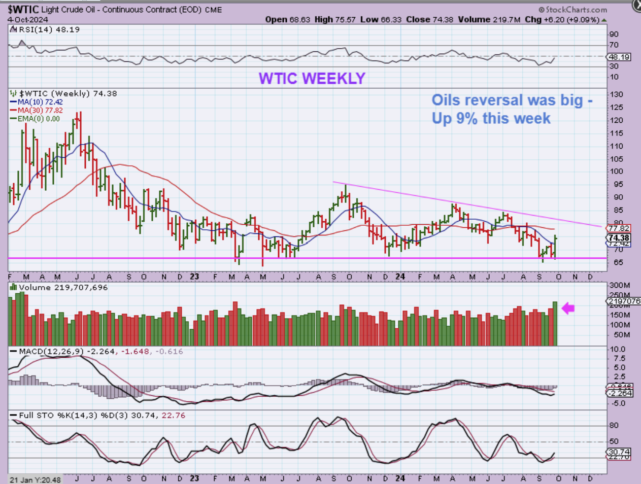 WTIC WEEKLY– We saw Oil reverse sharply this week, right at prior support. It was a little sudden, but Oil Stocks started to respond strongly too, so you have to let price action and volume tell you what is going on.