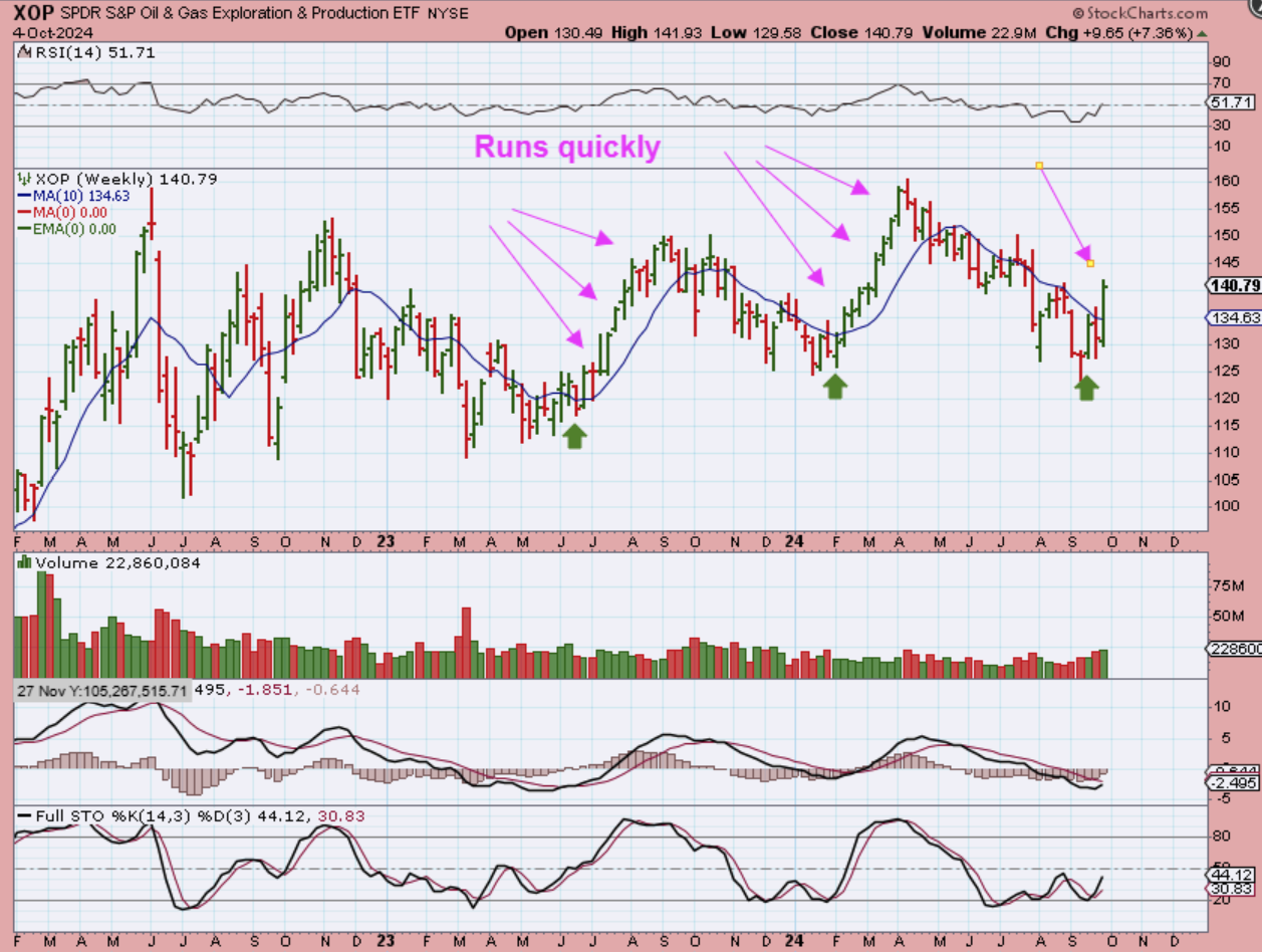 THE XOP WEEKLY had a large 7% pop this week too and in prior runs out of the lows, it was pretty green week after week after week, as seen below. Oil stocks became a buy.