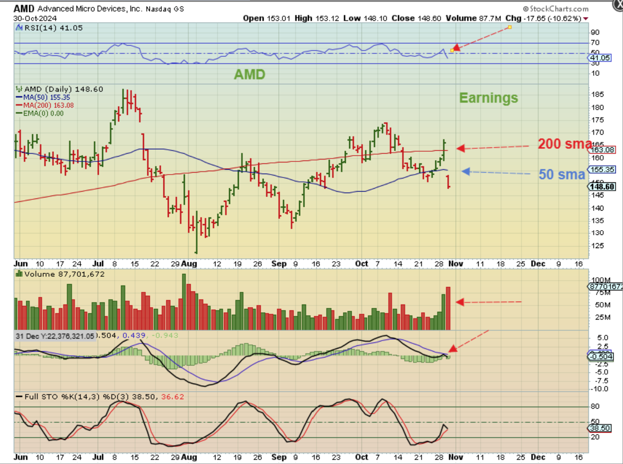 AMD had an earnings report that, after a nice run up & over the 200sma this week, slammed it down below both the 50 & 200sma.