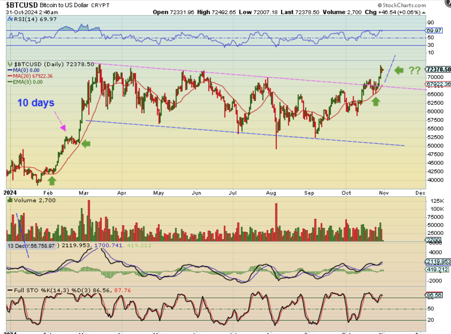 About a week ago I pointed out that in the past when Bitcoin rallied straight up and pulled away from the 20 ema, so it took time to pull back or chop over to that 20ema again. It actually took 10 long days to chop sideways last February. COULD THAT HAPPEN HERE? It could, since breaking out to new all-time highs can initially take some time (Cup and handles do that for example). So…