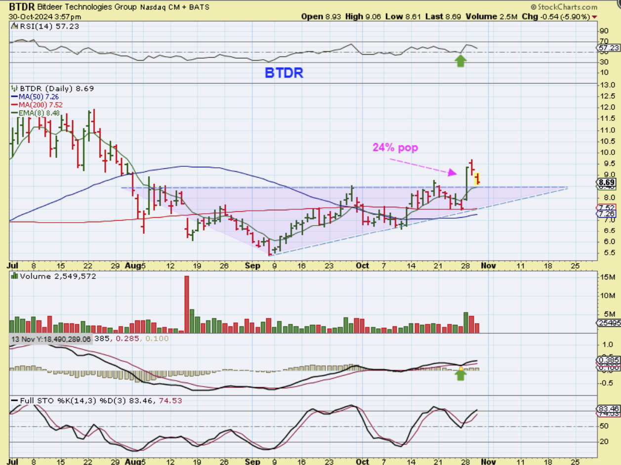 BTDR had that 24% Pop on Monday, and I wanted to add to my position. This drop to the 8ema (or 10sma) could be all that we get if Bitcoin pushes higher, or it may also fall all the way back to the 50 / 200sma if Bitcoin pulls back into a dcl, but it does offer a buy opportunity anywhere in this area if you can ride the pullback.