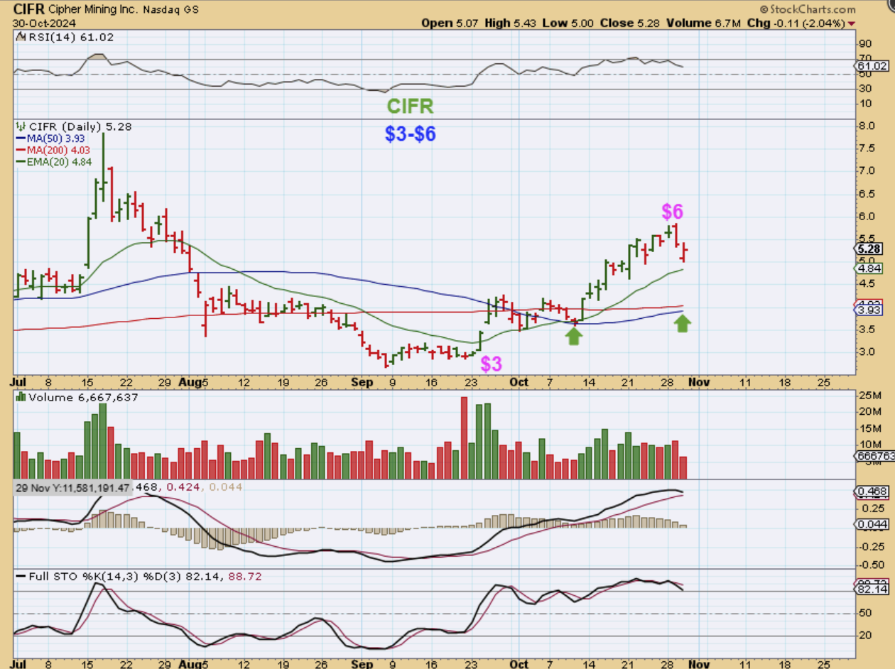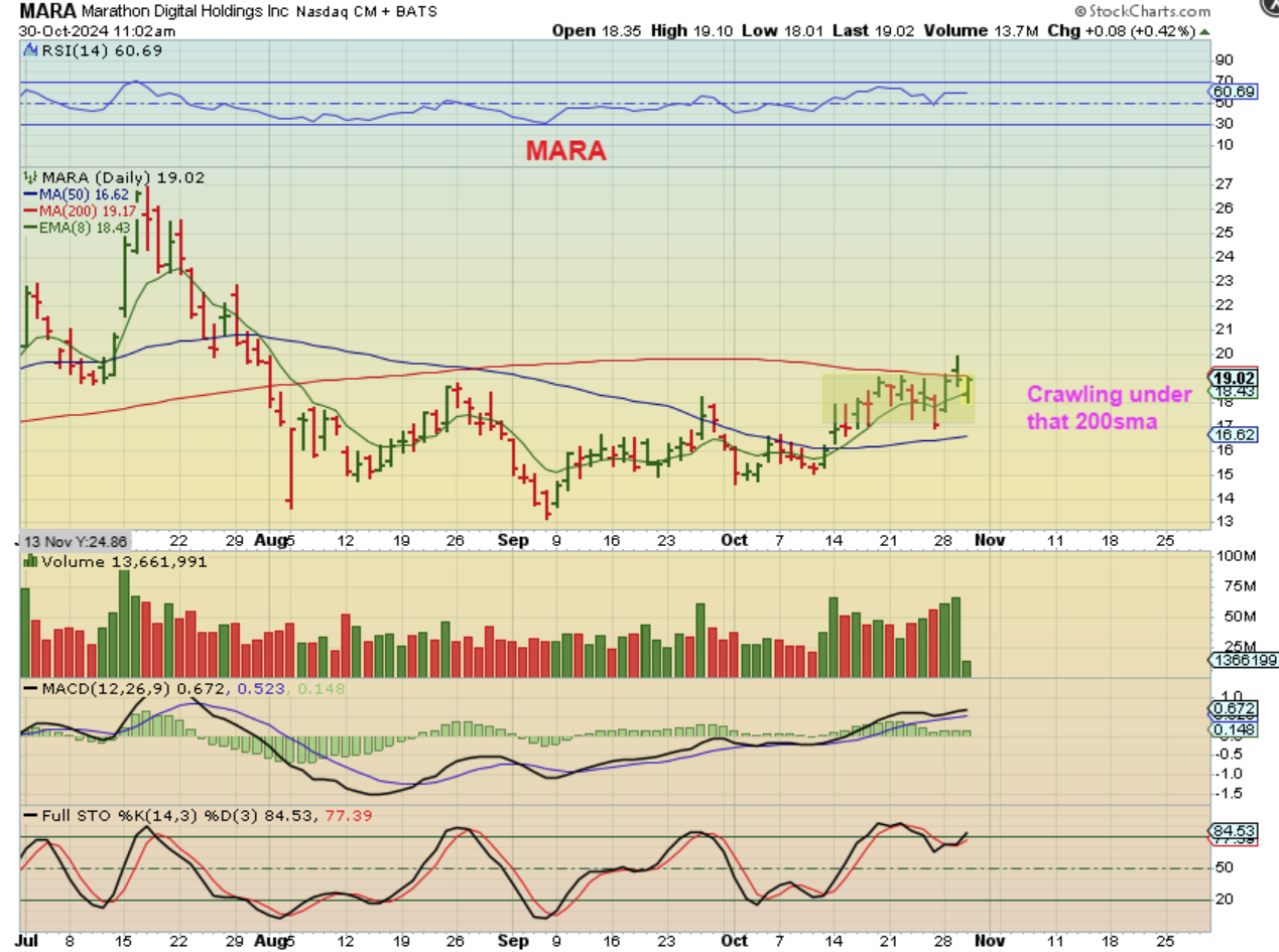 MARA has been ‘crawling’ along the 50sma and usually this leads to a breakout. The only problem is EARNINGS next week on Nov 7. Both Riot and MSTR released earnings Wednesday after the bell and both dropped initially.