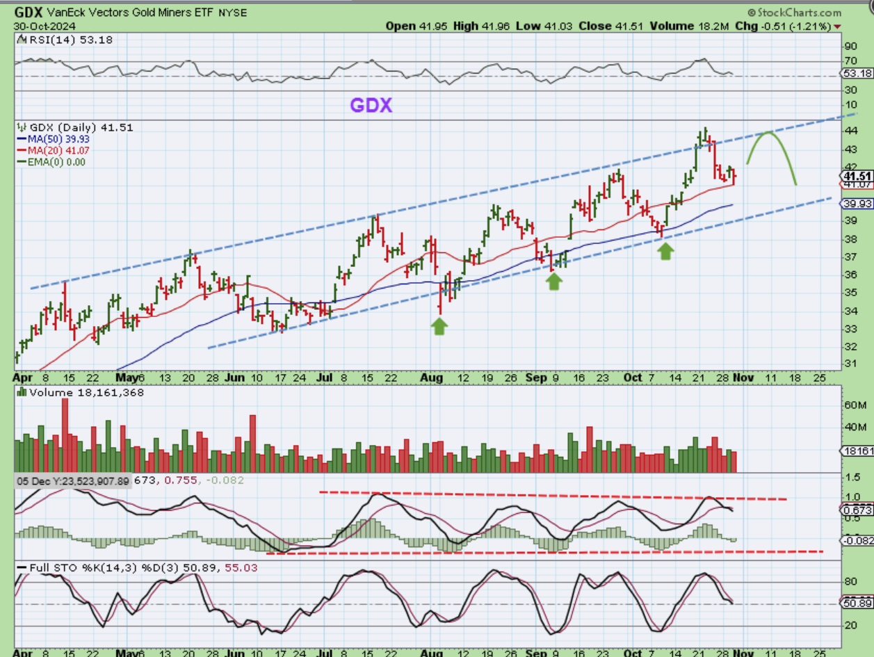 GDX may also be putting in a half cycle low, especially if the USD drops from here. It found support at the 20 ema and may bounce to the upper trend line, but I don’t personally really expect more than that. Once the ‘peak’ is in, it bounces, and the MACD and RSI look to have peaked.