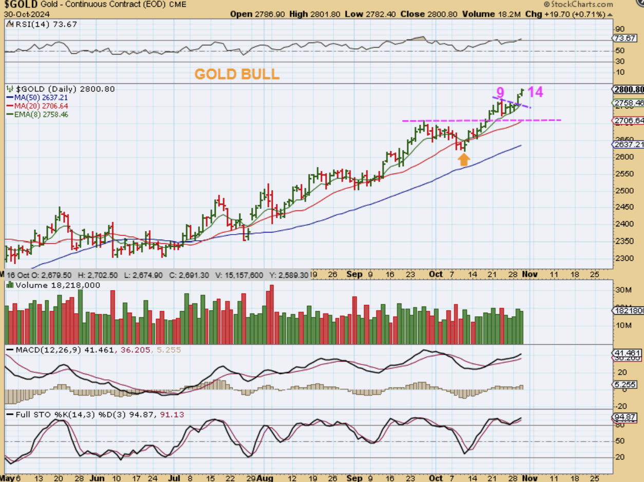 GOLD has made a day 14 high and is really showing its strength. I do NOT want this to just keep running higher into a blow off top at $3000, because it will likely crash after that. Also noteworthy is…