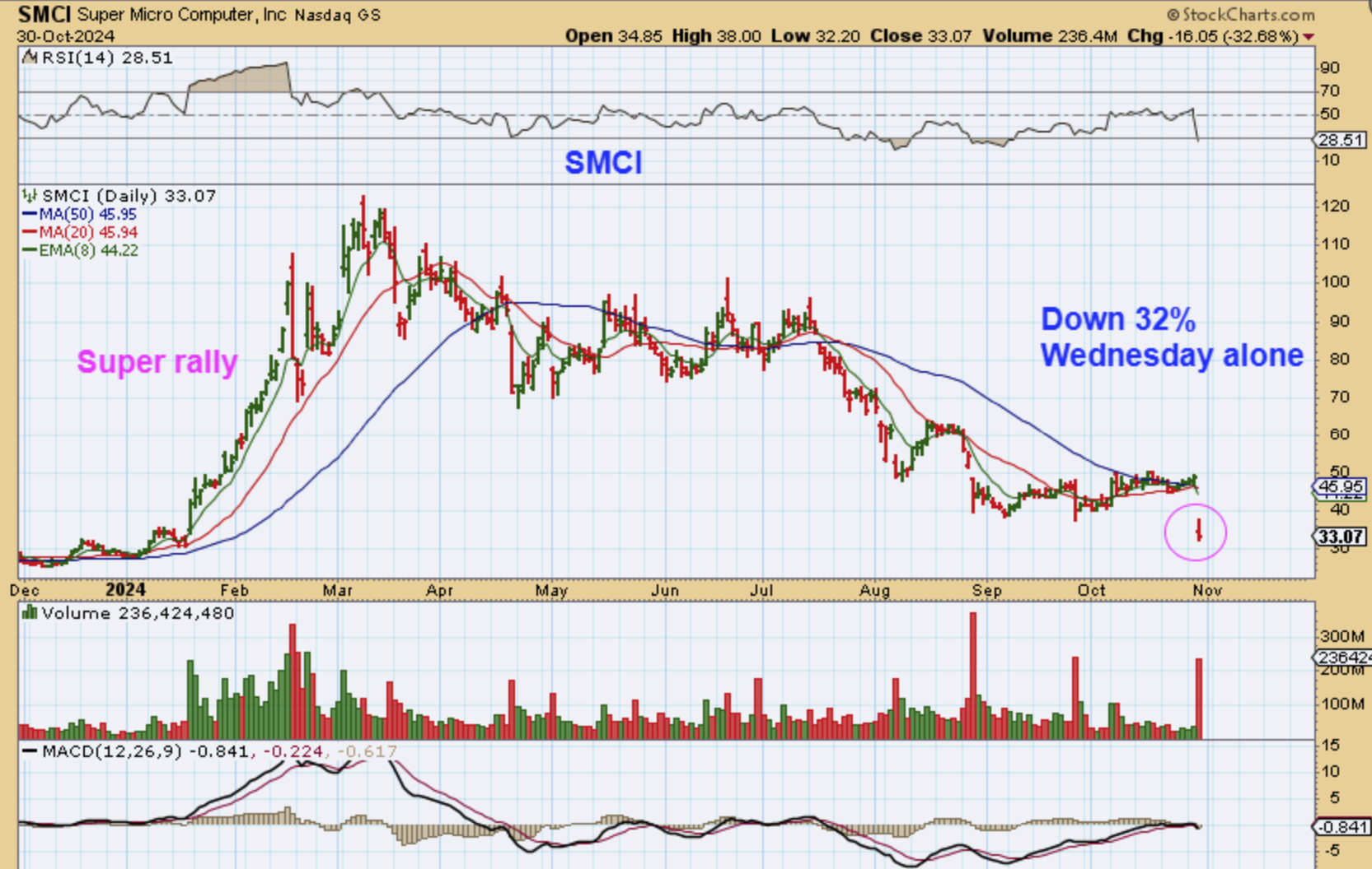 Lets just start with SMCI: It dropped 32% yesterday alone, when Ernst & Young resigned as Super Micro’s auditor, citing significant concerns over the company’s internal controls, board independence, and accounting practices. The stock crashed.