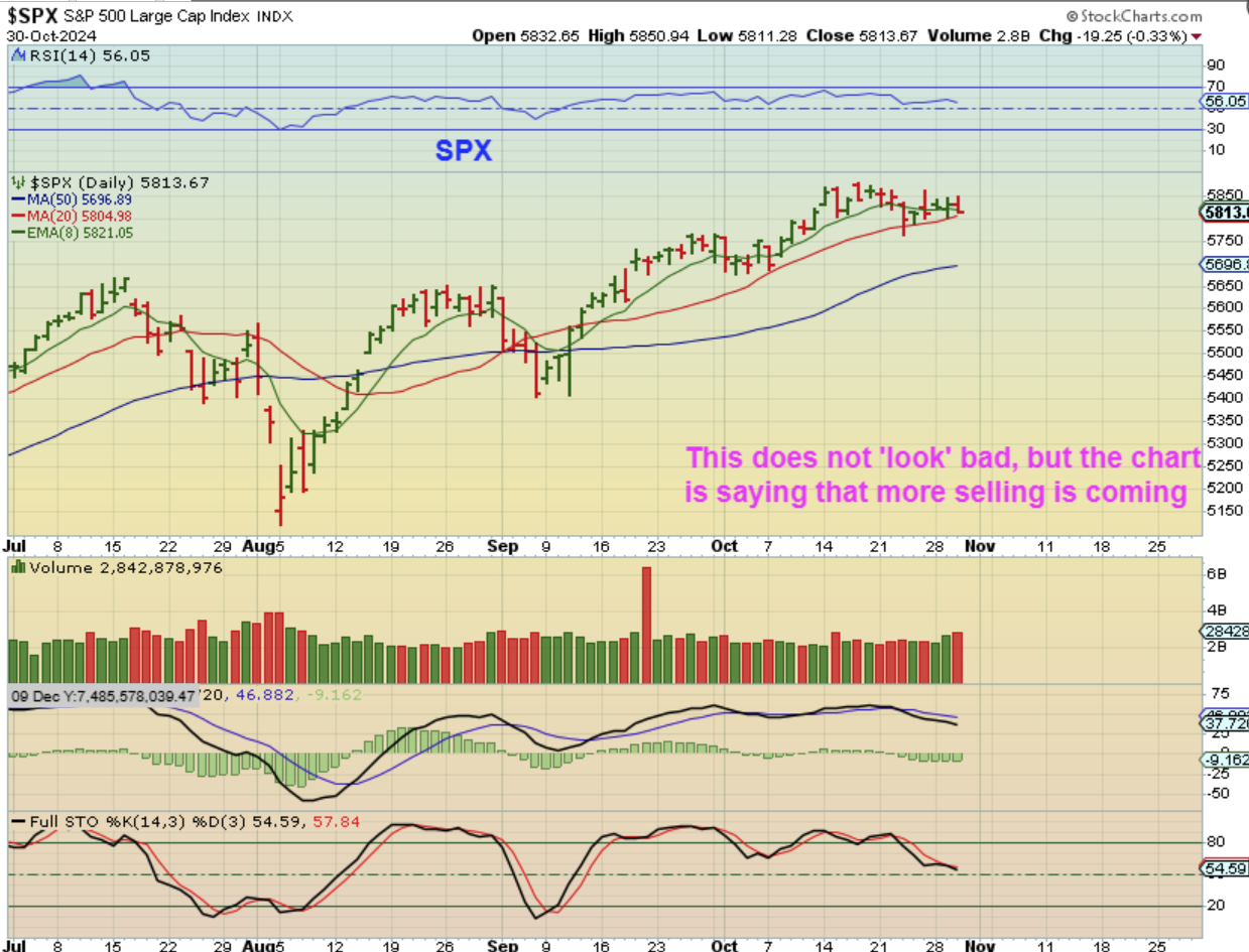 Now we move to The SPX: This is fine as it is, but that MACD cross lower that took place a week ago has not improved. If the SOXX breaks down, that could start the selling elsewhere too (again, the old saying is that Semiconductors lead the markets, and right now they are weak). I’m a bit cautious with the General Markets.