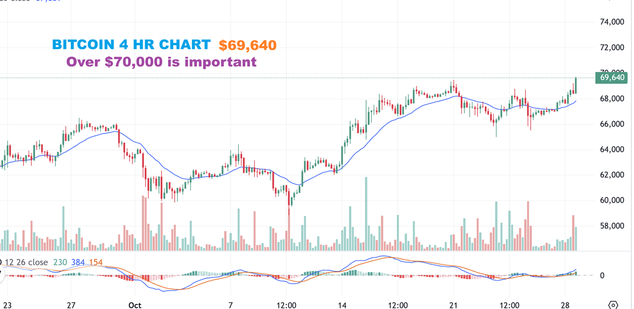So on Monday I was seeing crypto stocks taking off and I was watching that $70,000 area on Bitcoin. I posted this 4 hr chart as it tagged $69,640…