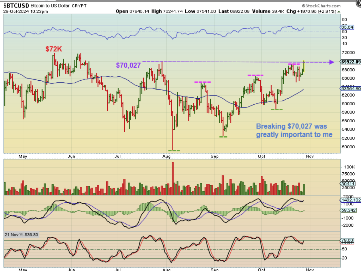 So now we DEFINITELY see that the Bitcoin breakout is visually apparent now as it reached $69,924. There is a Second reason why I have been waiting for $70,000…