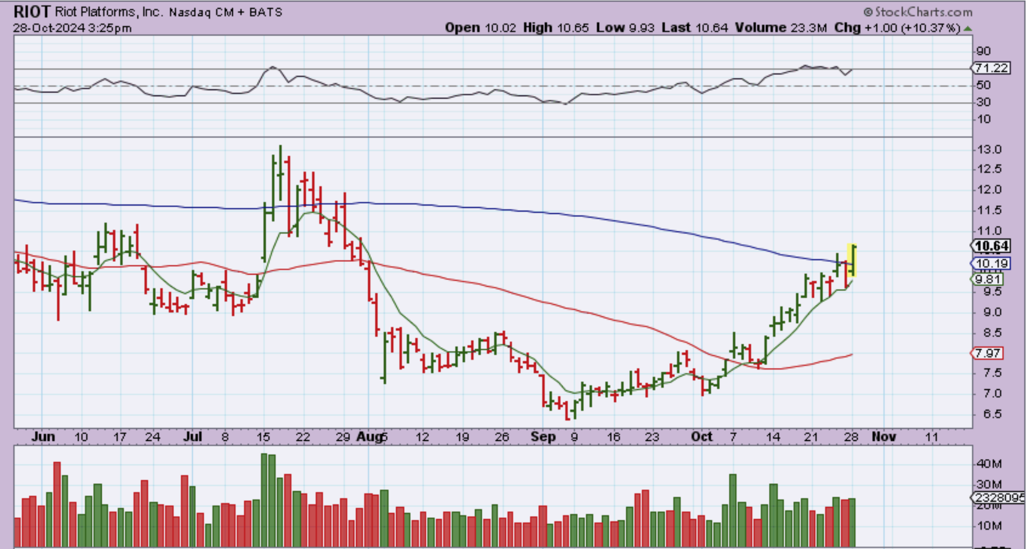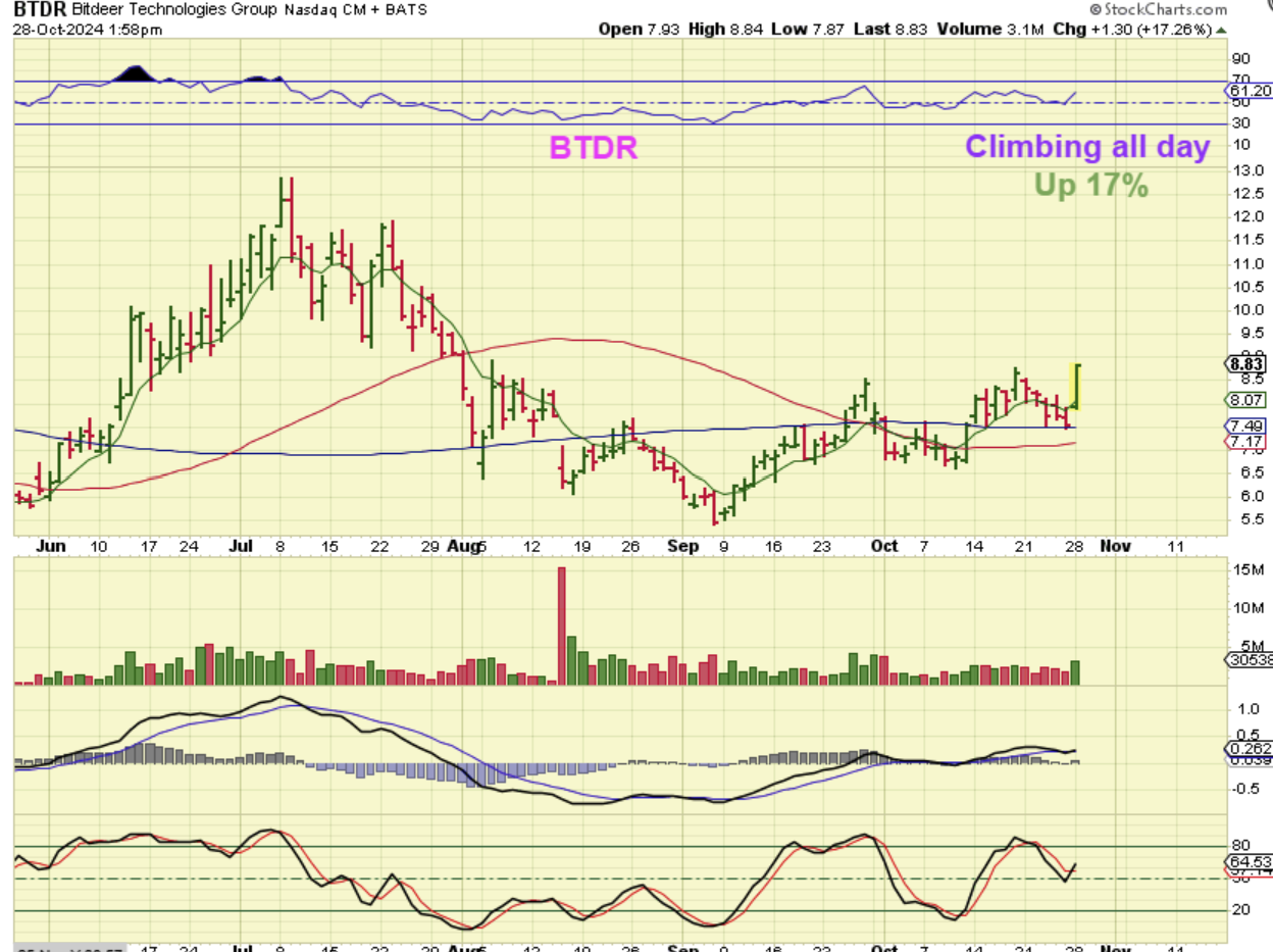 After bouncing off of the blue 200sma, BTDR ramped up 17% by 2 p.m., and it actually closed up 24.44%! What a great day for some of these Crypto-Miners.
