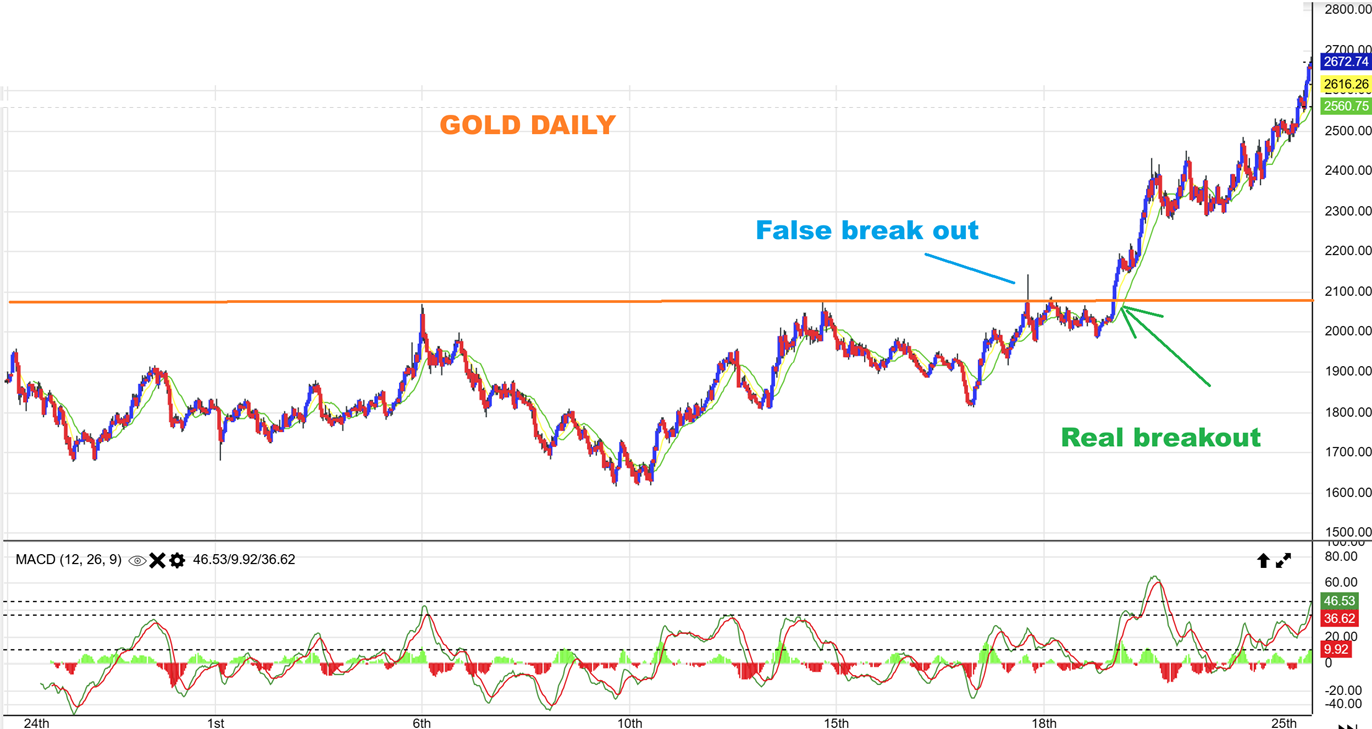 Do not let that above chart of a false breakout scare you into selling though. Notice that after the false breakout, Gold chopped sideways at the highs and then once Gold broke out for real (& Bitcoin may be breaking out here for real) it didn’t even back-test. It ran higher and didn’t look back. It chopped sideways with a pennant, and then kept going.