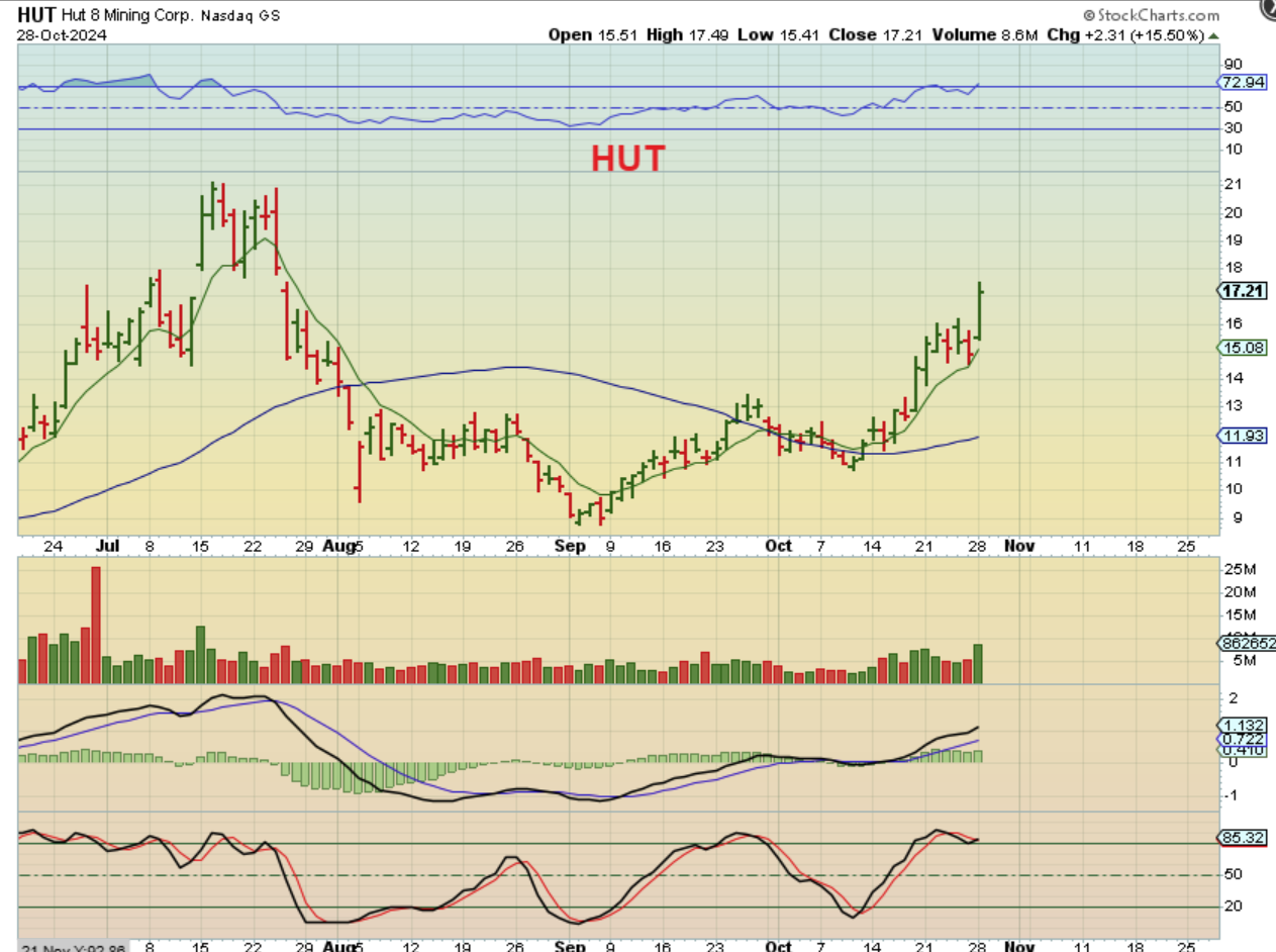 HUT has moved from $11 to $17.49 in 2 weeks. GREAT GAINS, but I think there will be a lot more gains in these as Bitcoin breaks out and runs.