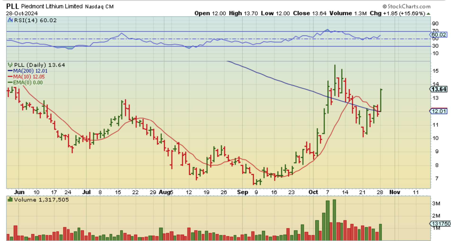 PLL – Last week I had pointed out that PLL and LAC were bullishly pushing at the 200sma, after already putting in a nice rally.