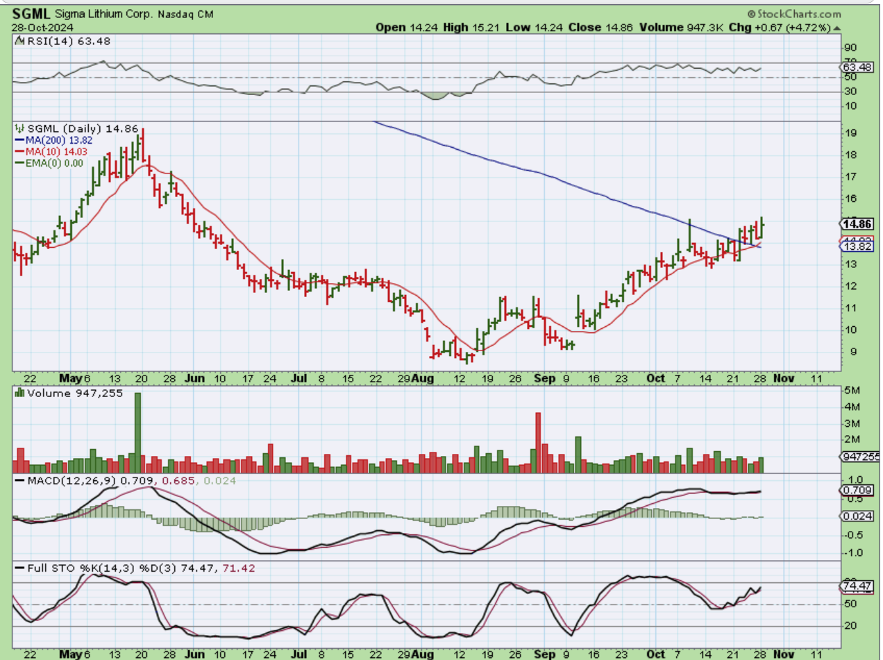 SGML I also pointed out SGML as a lithium stock and it continues to chop higher $13 to $15 and has also broken above the 200sma.