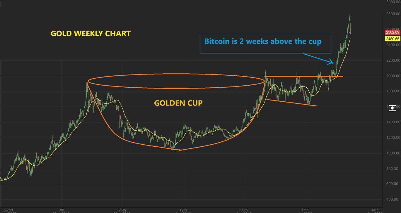 GOLD WEEKLY CUP: Take a look at Golds Weekly Cup. There were pauses along the way, but Bitcoin is only 2 weeks above the cup and here when Gold broke out in Feb 2024 it ramped up for a few weeks. It is still simply giving minimal pullbacks, so Bitcoin can run for a while (with dcls and dips along the way, of course).