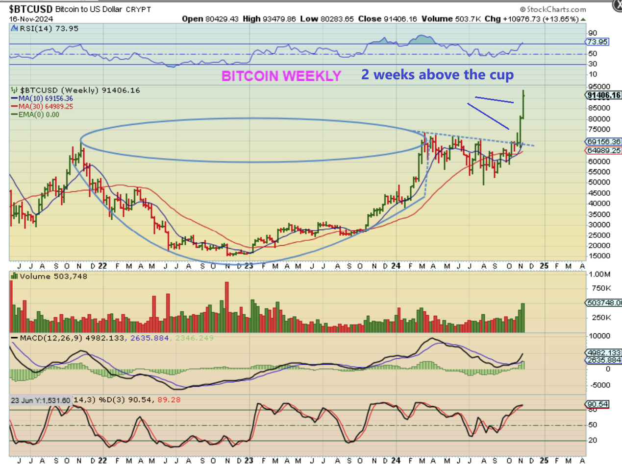 BITCOINS WEEKLY CUP: I wanted to start by taking a look at the cup and handle breakout. Bitcoin has had 2 very strong weeks higher, but can this surge higher last much longer?