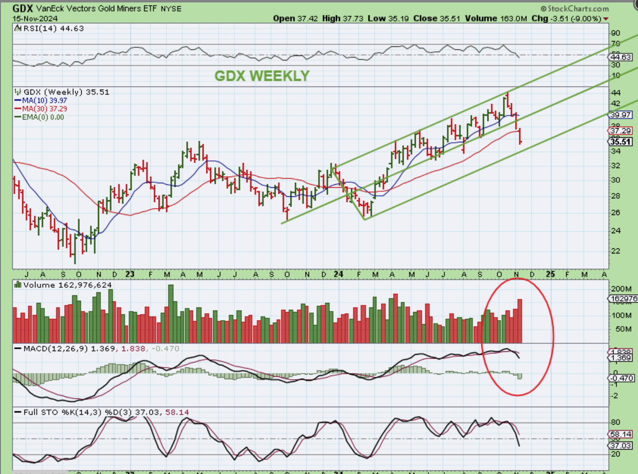 GDX WEEKLY – Using Andrews Pitchfork, we see that the GDX lost the upper channel and also broke below the 30 week ma. Similar to Gold and Silver, GDX is dropping into an ICL, but may need 1 more daily cycle to complete the move / bottoming process. This does look similar to the drop in March of 2023, however, and that was simply a straight down 4-5 week drop.