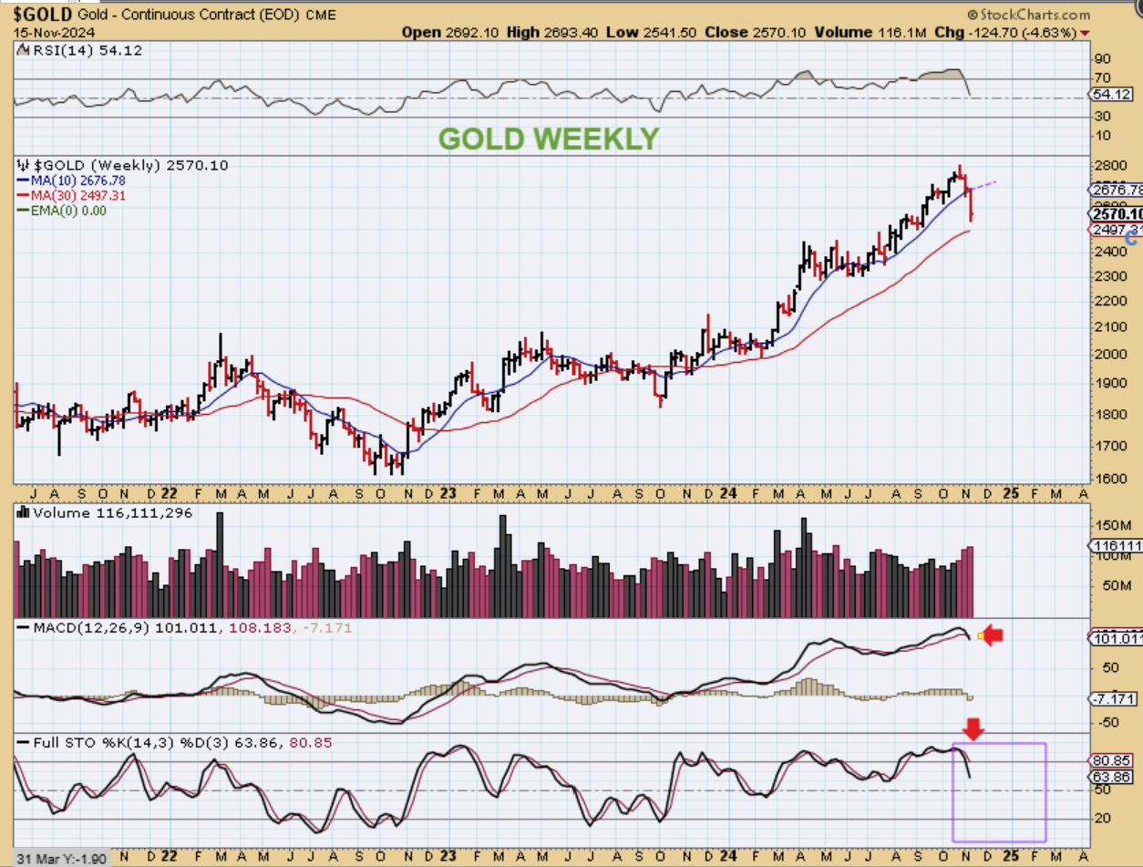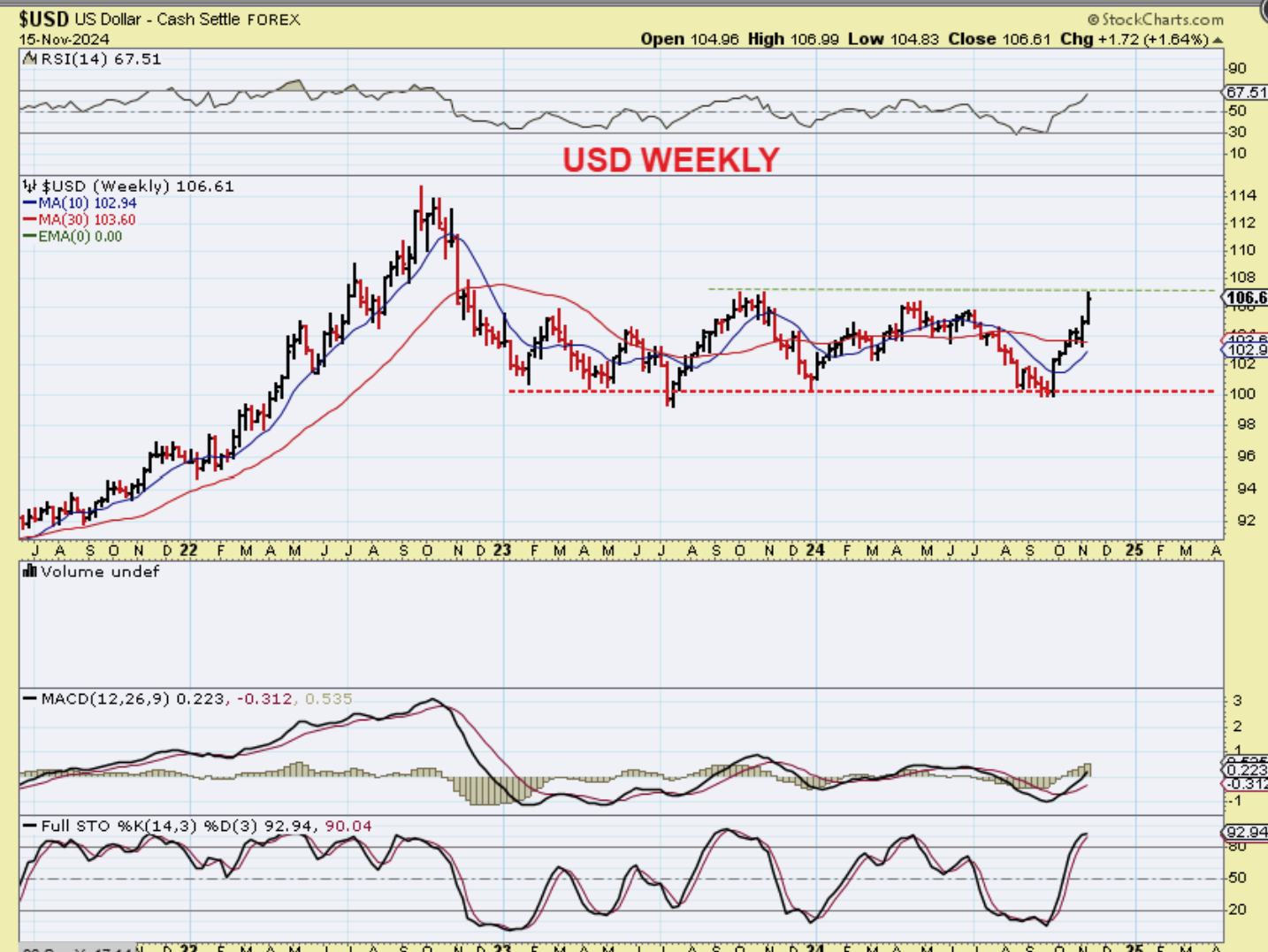 USD WEEKLY – The USD hit the $107 area last week and I have been looking for possibly a peak at $107.50. At the rate that this has been climbing, it may break that $107.50 area next week and go even higher? The USD has been climbing for 7 straight weeks and the good news is that Gold has NOT been dropping for the past 7 weeks, but it DID drop sharply last week as the USD rose sharply. Let’s take a look…