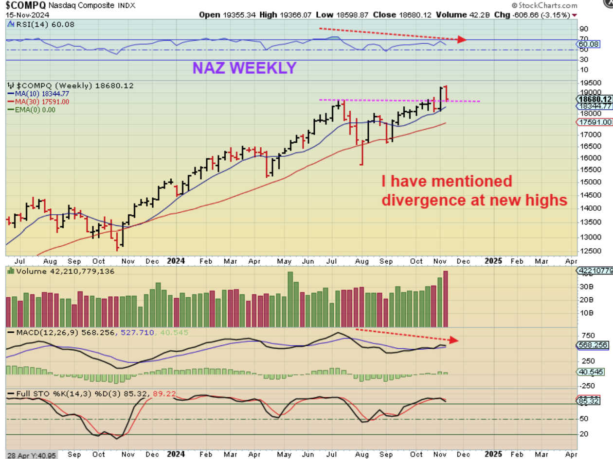 NASDAQ WEEKLY – The weekly Nasdaq chart closed down 3% and it also doesn’t look bad all by itself, but we do see weekly divergence at the highs and next we’ll discuss the SOXX.