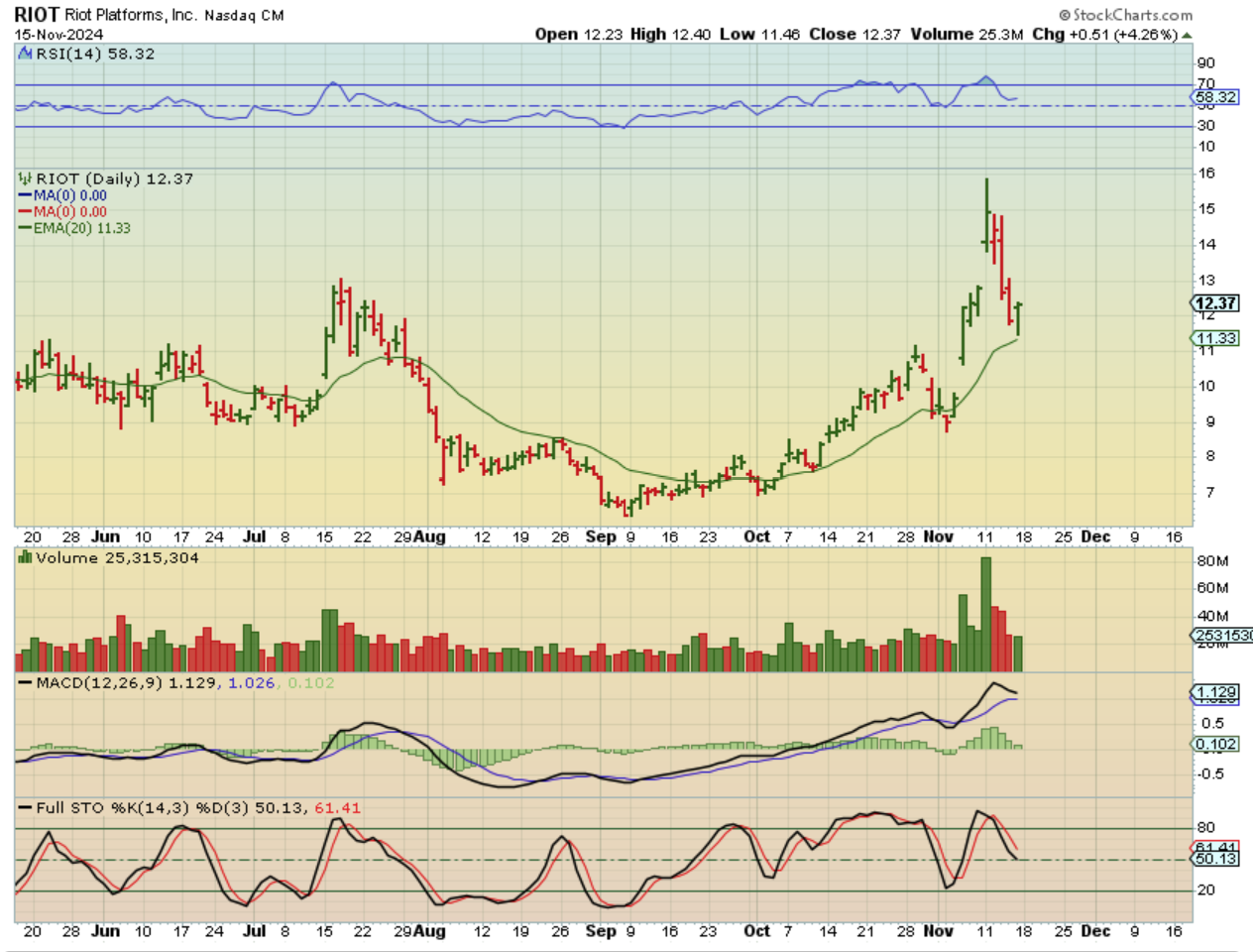 RIOT almost tagged the 20 ema on Fridays dip and then reversed higher as the markets sold off. RIOT closed up over 4% with the general Markets selling off.