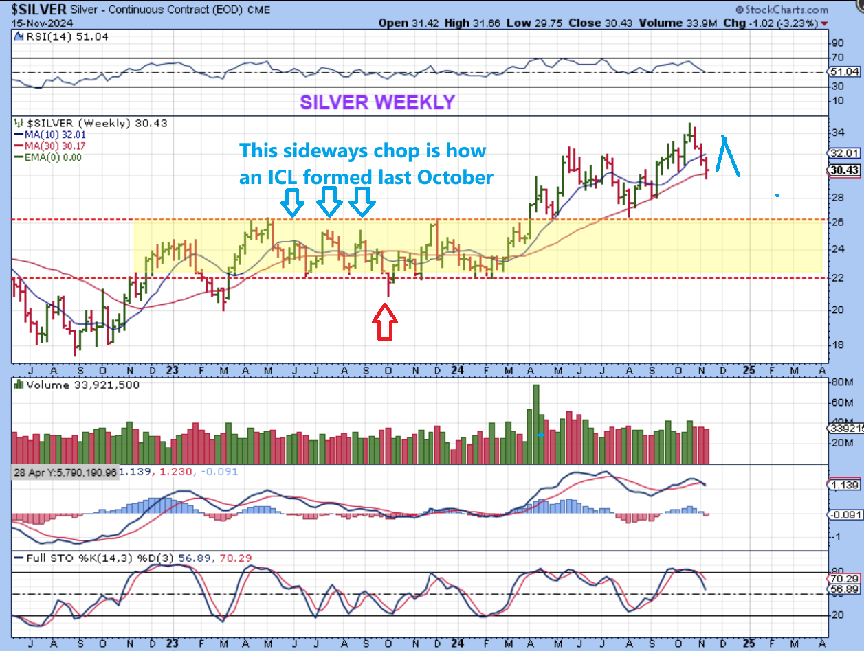 SILVER WEEKLY – I thought that it was interesting to see how the ICL formed last October with Silver. It simply spiked down and recovered after a couple of months of sideways choppy daily cycle. So right now Silver is on the 30 week ma and it may be ready to start another daily cycle, so we may again see sideways chop and the final low (ICL) may not be a drop to $26 support, but instead may just be a drop back to the 30 week ma.
