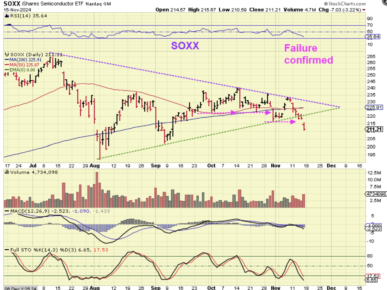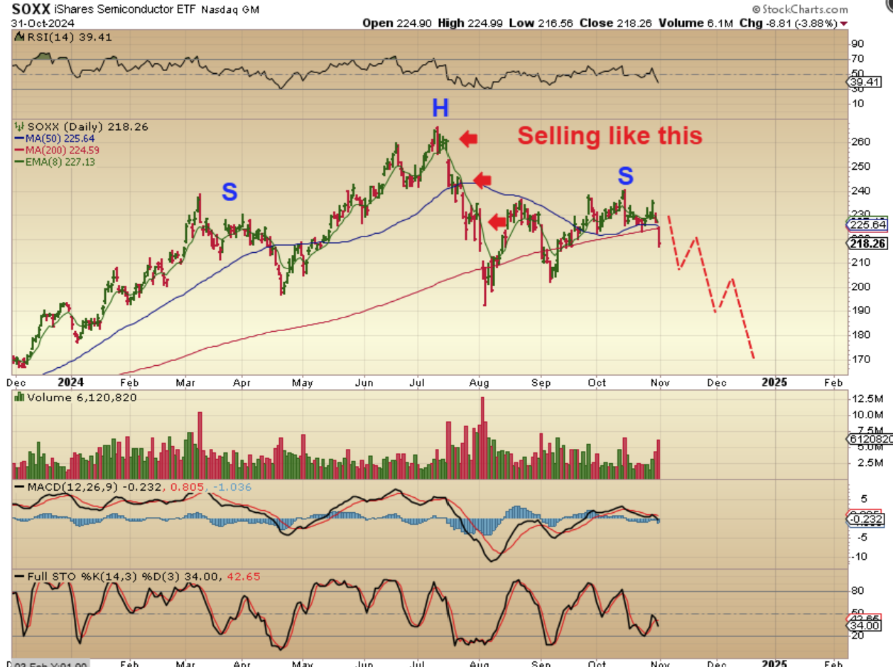 SOXX DAILY NOV 1st – 2 weeks ago I warned that the SOXX looked to be forming a large H&S pattern, and could bounce lower as drawn here…