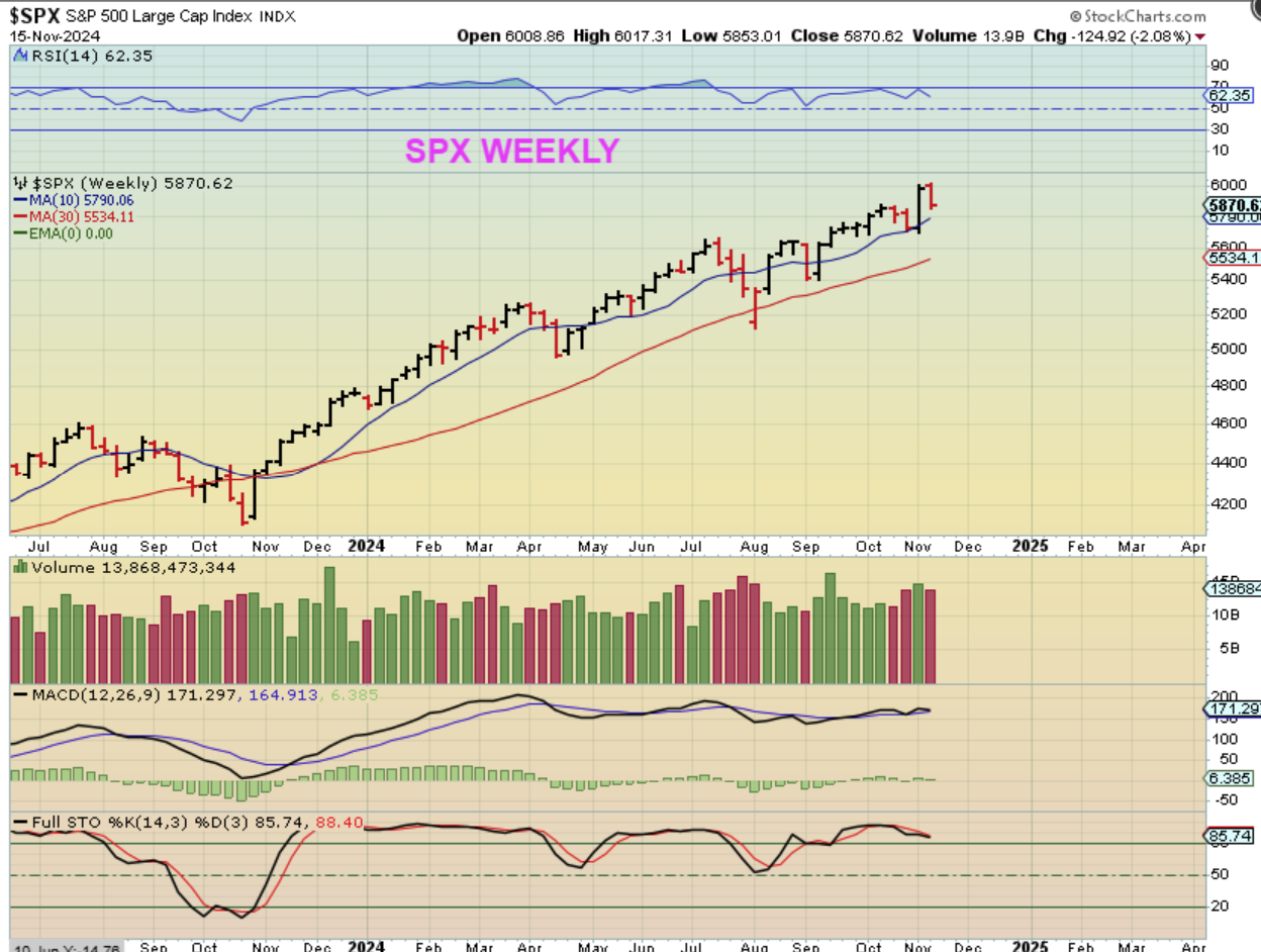 SPX WEEKLY -Again, this chart doesn’t look bad by itself, it actually hit new all-time highs this week, but it did close down 2% and the SOXX may be a warning sign.