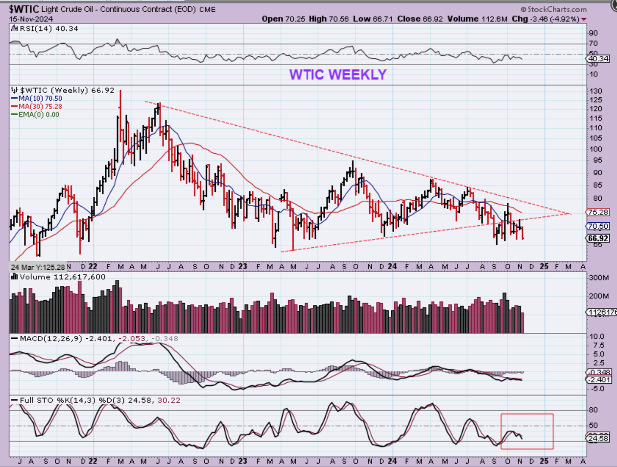 SOXX WEEKLY – The weekly chart now looks like a H&S has formed and we closed at last weeks lows. The SOXX lost the 10 & 30 week ma, and was down almost 9% for the week. THIS could lead the markets lower. The weekly MACD is a ‘weak’ MACD.