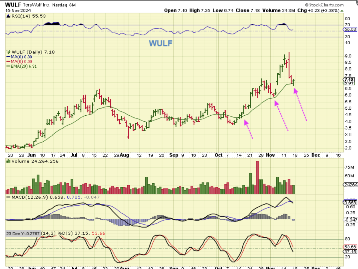 WULF DAILY – TeraWulf also reversed to green at the 20 ema, closing up over 3%.