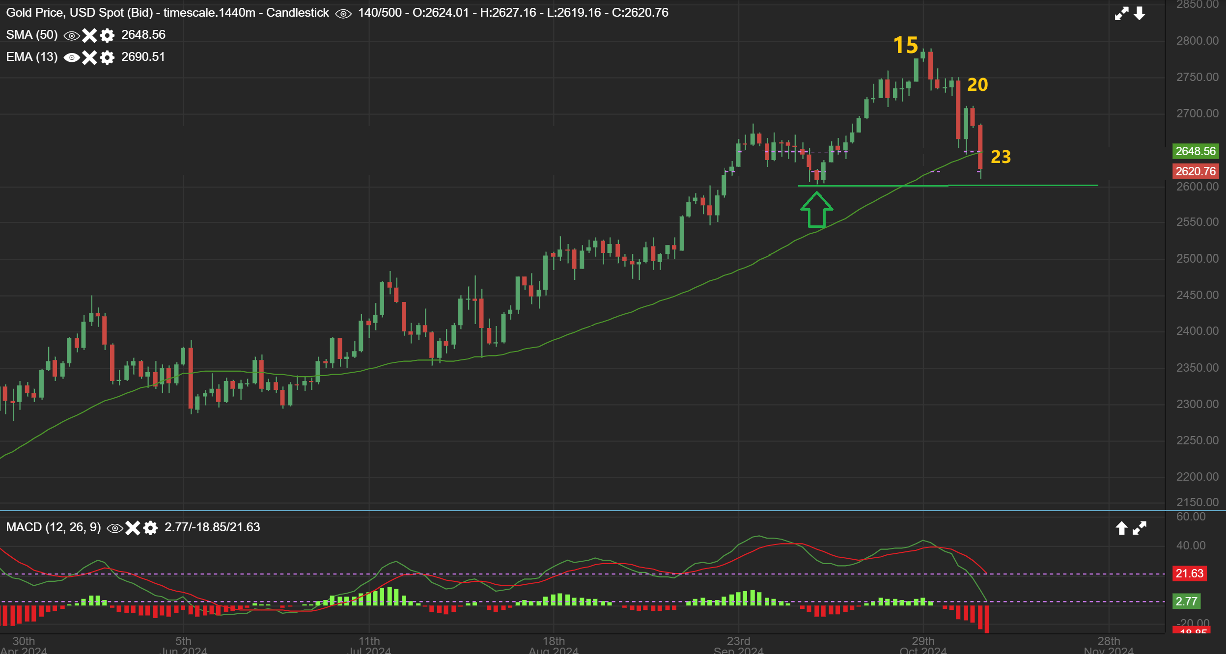 1. Monday saw another larger drop, so our symmetrical climb is now showing a different look to it, with these deeper sell offs breaking below the 34 sma.