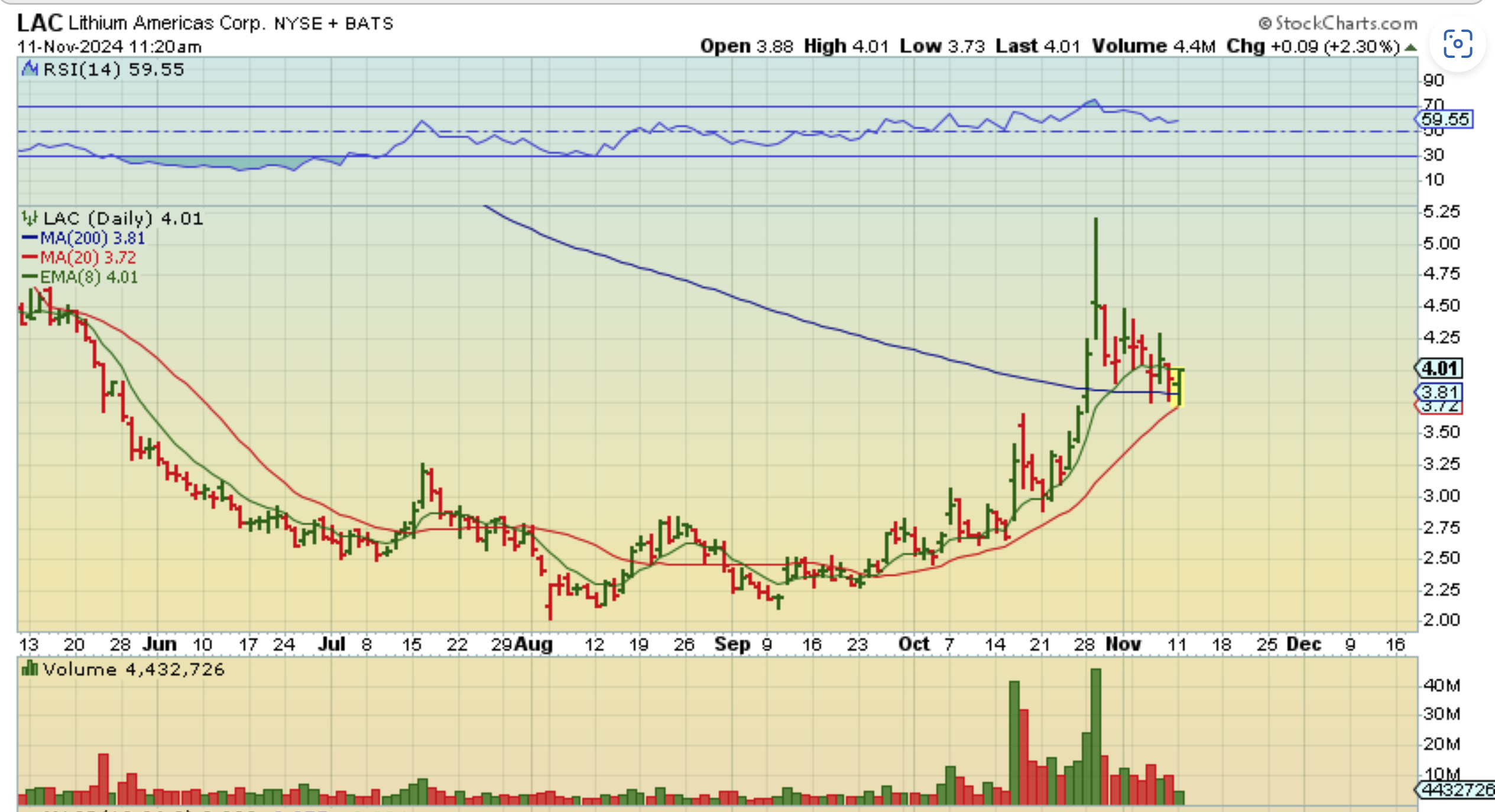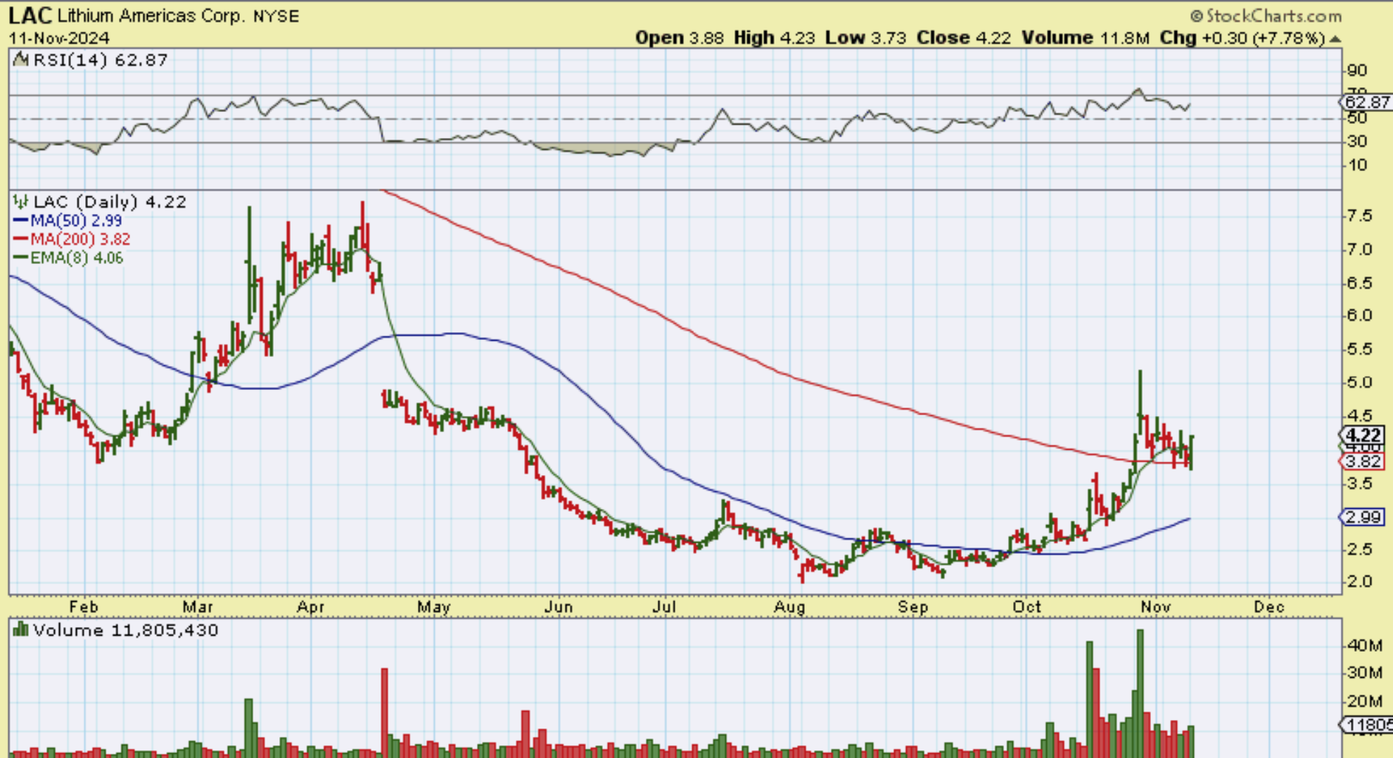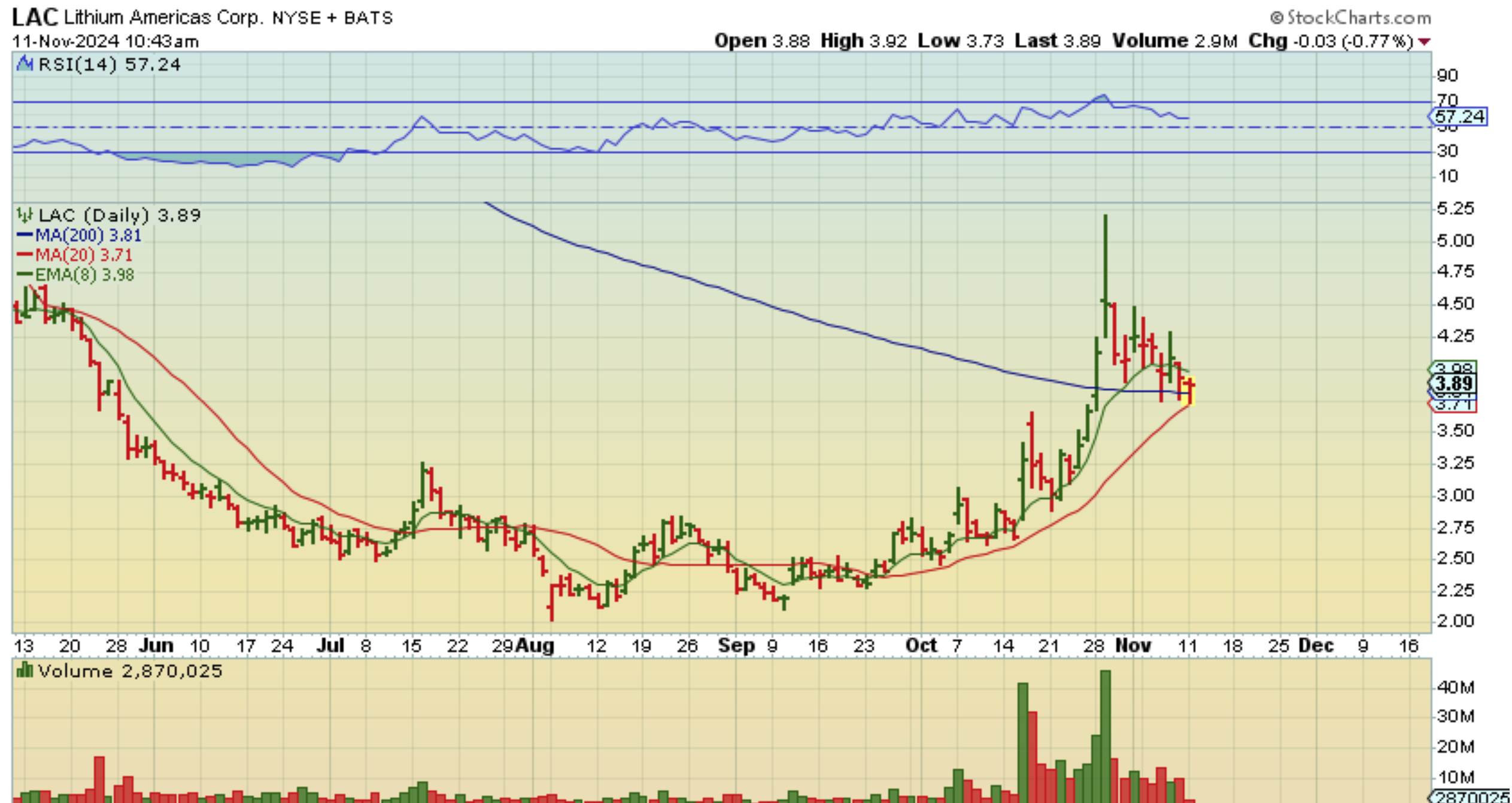 LAC – The trade was working, so I posted this chart showing it going from red to ‘up 2% now’.